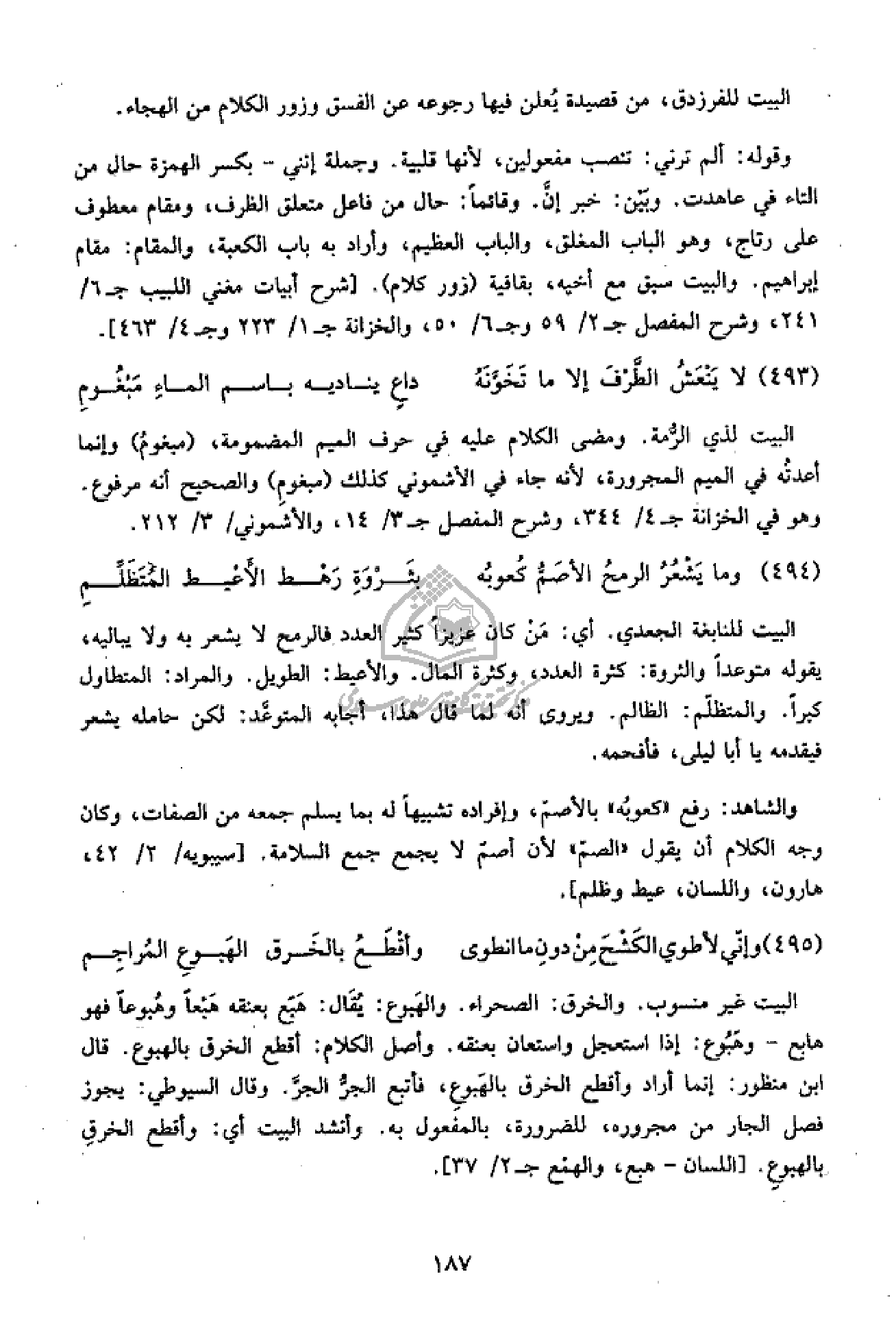 وقوله: ألم ترني: تنصب مفعولين، لأنها قلبية. وجملة إنني - بكسر الهمزة حال من التاء في عاهدت. وبين: خبر إنّ. وقائما: حال من فاعل متعلق الظرف، ومقام معطوف على رتاج، وهو الباب المغلق، والباب العظيم، وأراد به باب الكعبة، والمقام: مقام إبراهيم. والبيت سبق مع أخيه، بقافية (زور كلام). [شرح أبيات مغني اللبيب ج 6/ 241،