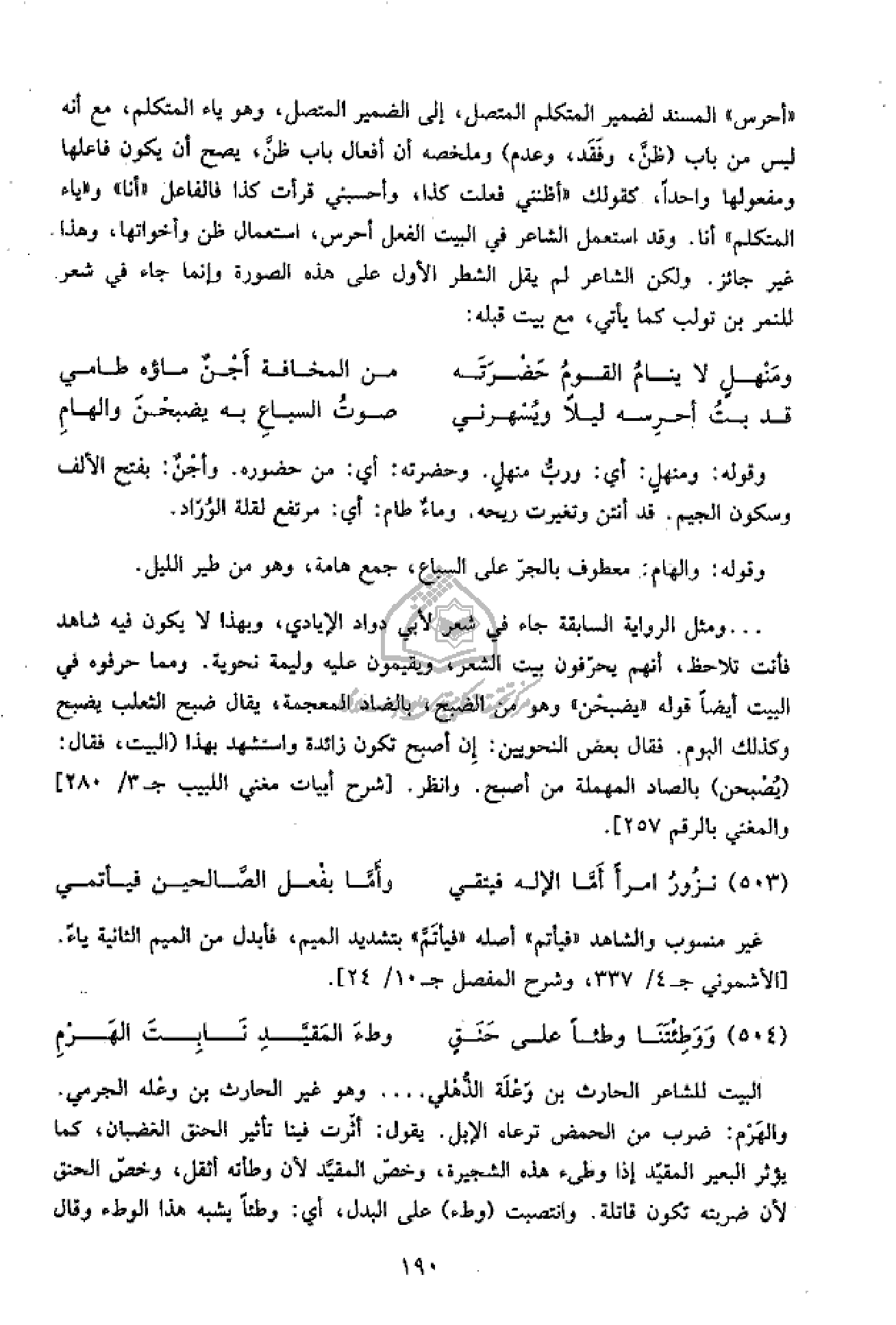 .. ومثل الرواية السابقة جاء في شعر لأبي دواد الإيادي، وبهذا لا يكون فيه شاهد فأنت تلاحظ، أنهم يحرّفون بيت الشعر، ويقيمون عليه وليمة نحوية. ومما حرفوه في البيت أيضا قوله «يضبحن» وهو من الضبح، بالضاد المعجمة، يقال ضبح الثعلب يضبح وكذلك البوم. فقال بعض النحويين: إن أصبح تكون زائدة واستشهد بهذا (البيت، فقال: