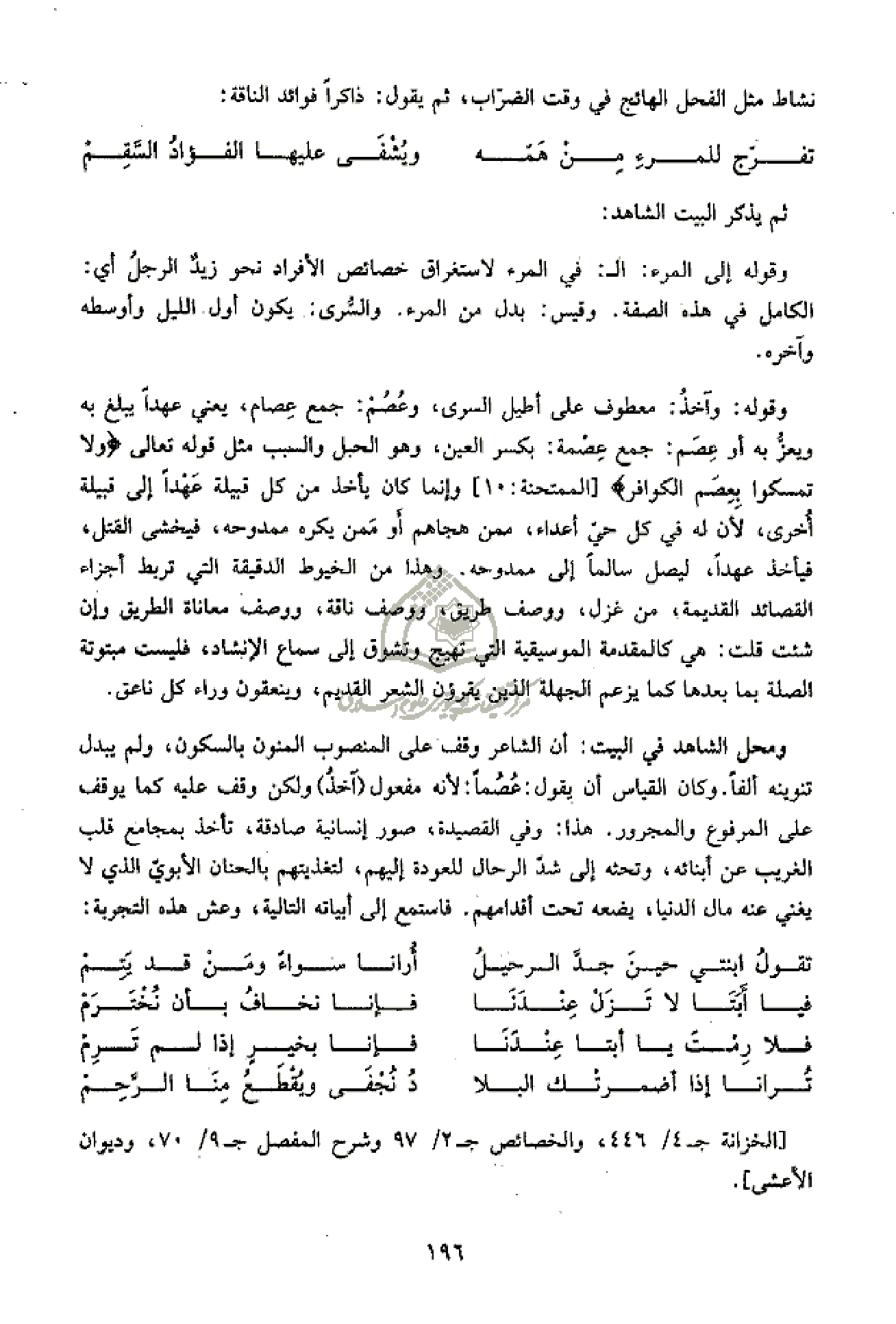 ومحل الشاهد في البيت: أن الشاعر وقف على المنصوب المنون بالسكون، ولم يبدل تنوينه ألفا. وكان القياس أن يقول: عصما: لأنه مفعول (آخذ) ولكن وقف عليه كما يوقف على المرفوع والمجرور. هذا: وفي القصيدة، صور إنسانية صادقة، تأخذ بمجامع قلب الغريب عن أبنائه، وتحثه إلى شدّ الرحال للعودة إليهم، لتغذيتهم بالحنان الأبويّ الذي لا يغني عنه مال الدنيا، يضعه تحت أقدامهم. فاستمع إلى أبياته التالية، وعش هذه التجربة: