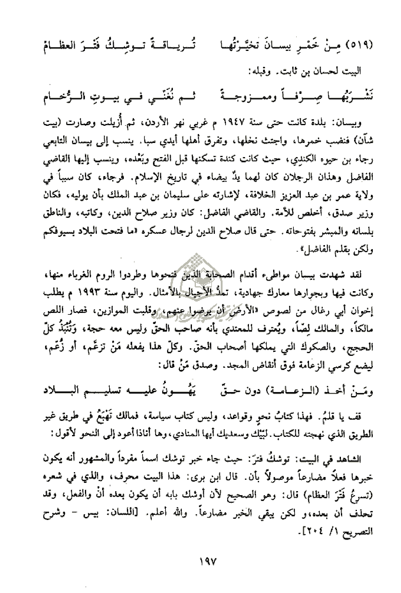 وبيسان: بلدة كانت حتى سنة 1947 م غربي نهر الأردن، ثم أزيلت وصارت (بيت شآن) فنضب خمرها، واجتث نخلها، وتفرق أهلها أيدي سبا. ينسب إلى بيسان التابعي رجاء بن حيوه الكندي، حيث كانت كندة تسكنها قبل الفتح وبعده، وينسب إليها القاضي الفاضل وهذان الرجلان كان لهما يد بيضاء في تاريخ الإسلام. فرجاء، كان سببا في ولاية عمر بن عبد العزيز الخلافة، لإشارته على سليمان بن عبد الملك بأن يوليه، فكان وزير صدق، أخلص للأمة. والقاضي الفاضل: كان وزير صلاح الدين، وكاتبه، والناطق بلسانه والمبشر بفتوحاته. حتى قال صلاح الدين لرجال عسكره «ما فتحت البلاد بسيوفكم ولكن بقلم الفاضل».