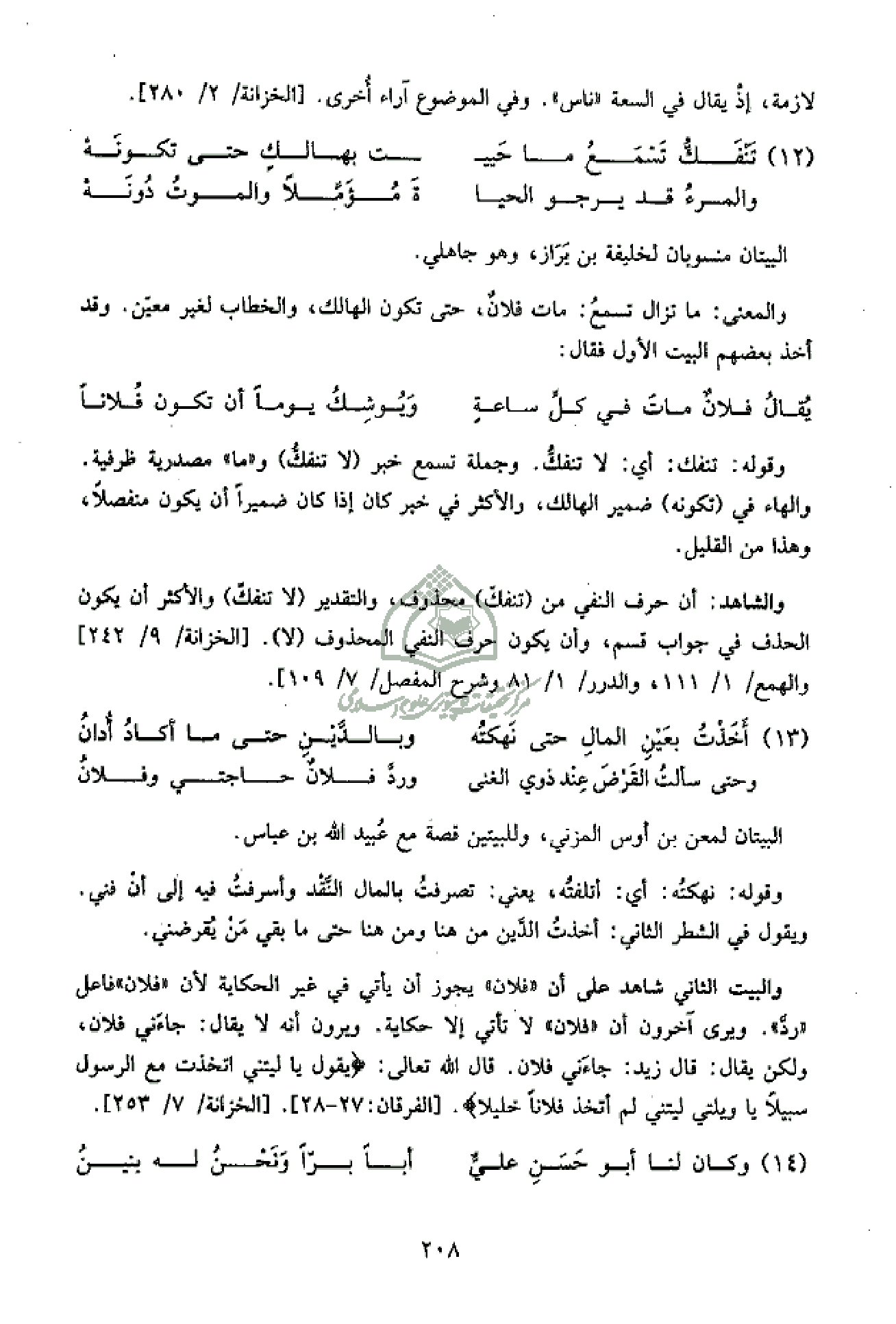 والبيت الثاني شاهد على أن «فلان» يجوز أن يأتي في غير الحكاية لأن «فلان» فاعل «ردّ». ويرى آخرون أن «فلان» لا تأتي إلا حكاية. ويرون أنه لا يقال: جاءني فلان، ولكن يقال: قال زيد: جاءني فلان. قال الله تعالى: يَقُولُ يا لَيْتَنِي اتَّخَذْتُ مَعَ الرَّسُولِ سَبِيلًا يا وَيْلَتى لَيْتَنِي لَمْ أَتَّخِذْ فُلاناً خَلِيلًا. [الفرقان: 27 - 28]. [الخزانة/ 7/ 253].