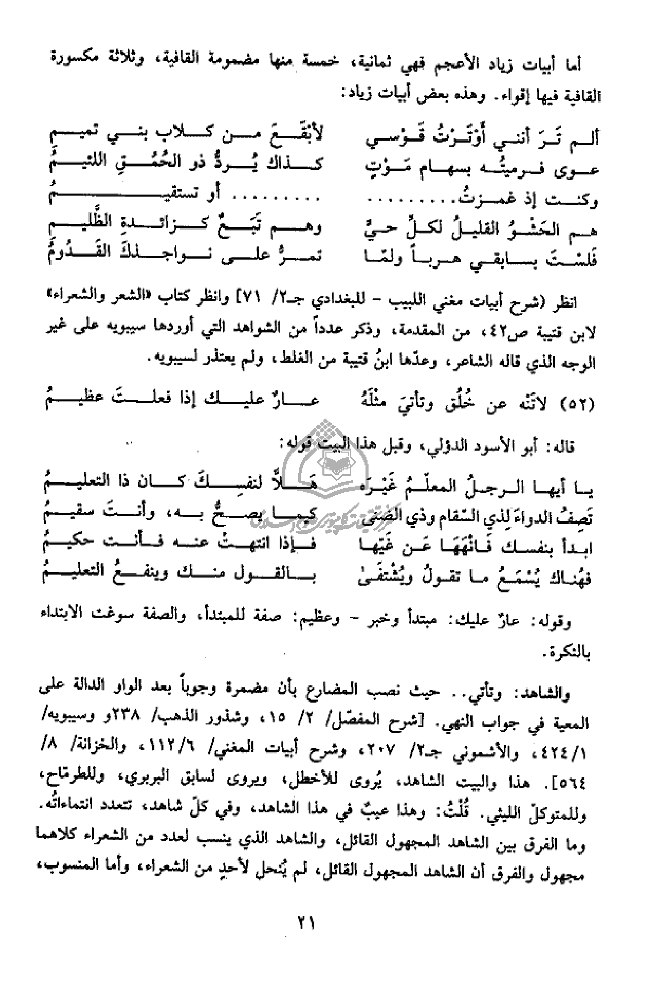 أما أبيات زياد الأعجم فهي ثمانية، خمسة منها مضمومة القافية، وثلاثة مكسورة القافية فيها إقواء. وهذه بعض أبيات زياد: