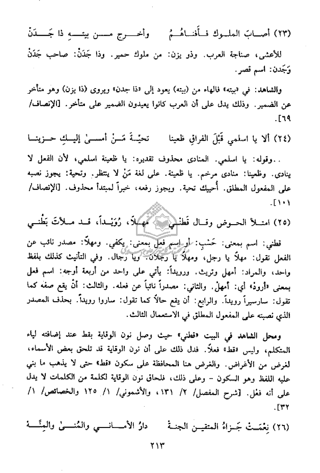 والشاهد: في «بيته» فالهاء من (بيته) يعود إلى «ذا جدن» ويروى (ذا يزن) وهو متأخر عن الضمير. وذلك يدل على أن العرب كانوا يعيدون الضمير على متأخر. [الإنصاف/ 69].