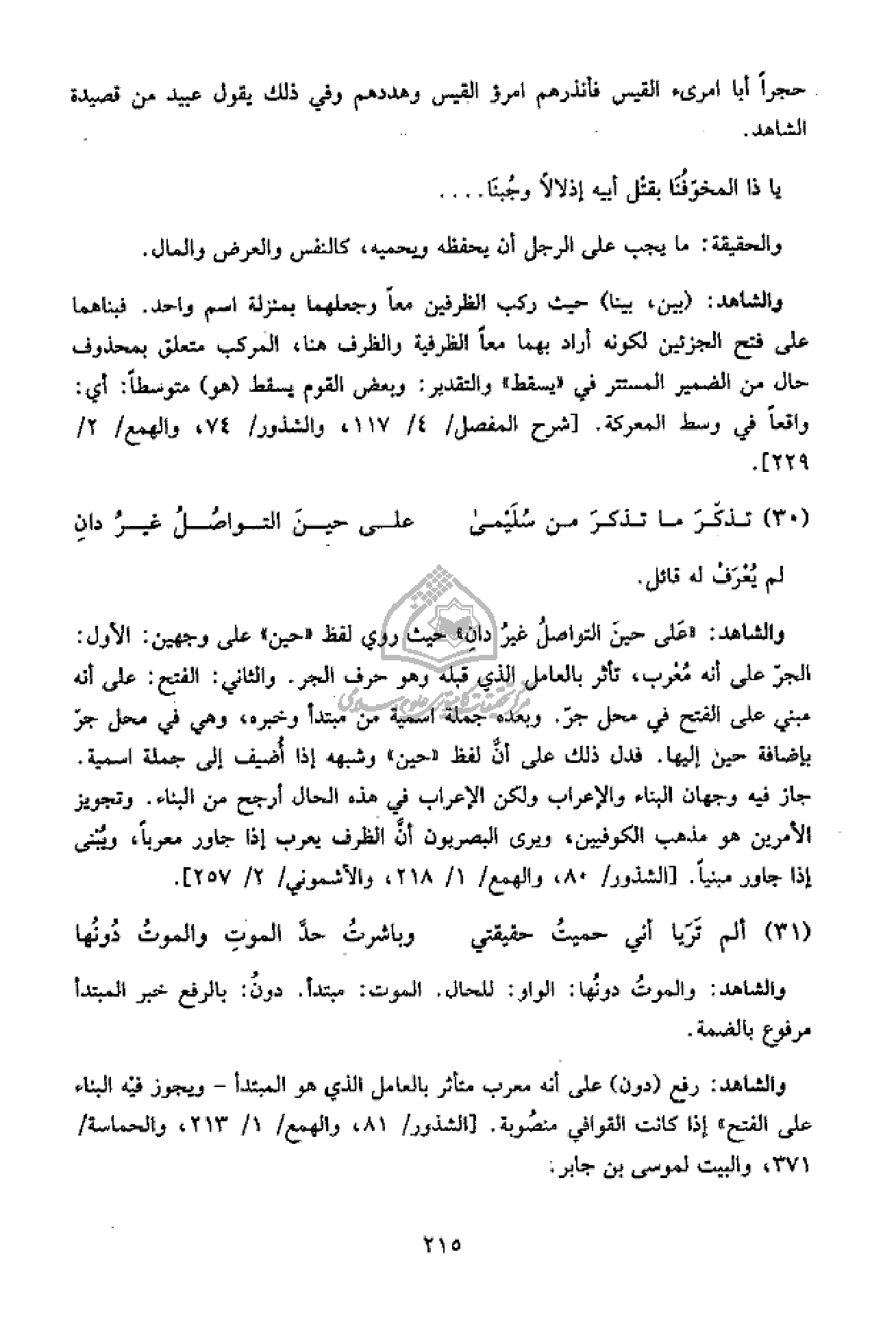 والشاهد: رفع (دون) على أنه معرب متأثر بالعامل الذي هو المبتدأ - ويجوز فيه البناء على الفتح» إذا كانت القوافي منصوبة. [الشذور/ 81، والهمع/ 1/ 213، والحماسة/ 371، والبيت لموسى بن جابر.