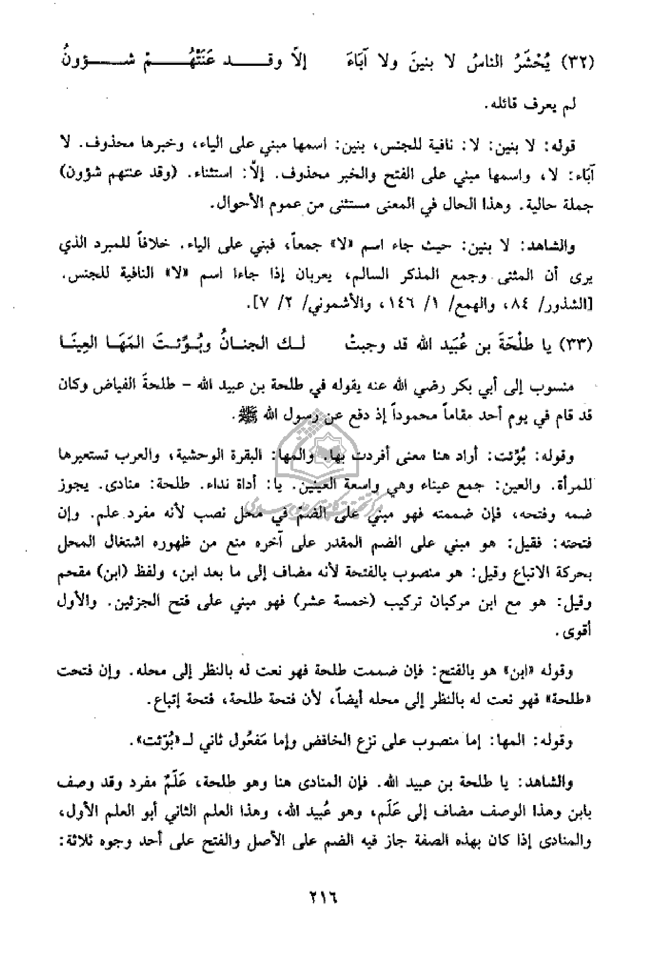 وقوله «ابن» هو بالفتح: فإن ضممت طلحة فهو نعت له بالنظر إلى محله. وإن فتحت «طلحة» فهو نعت له بالنظر إلى محله أيضا، لأن فتحة طلحة، فتحة إتباع.