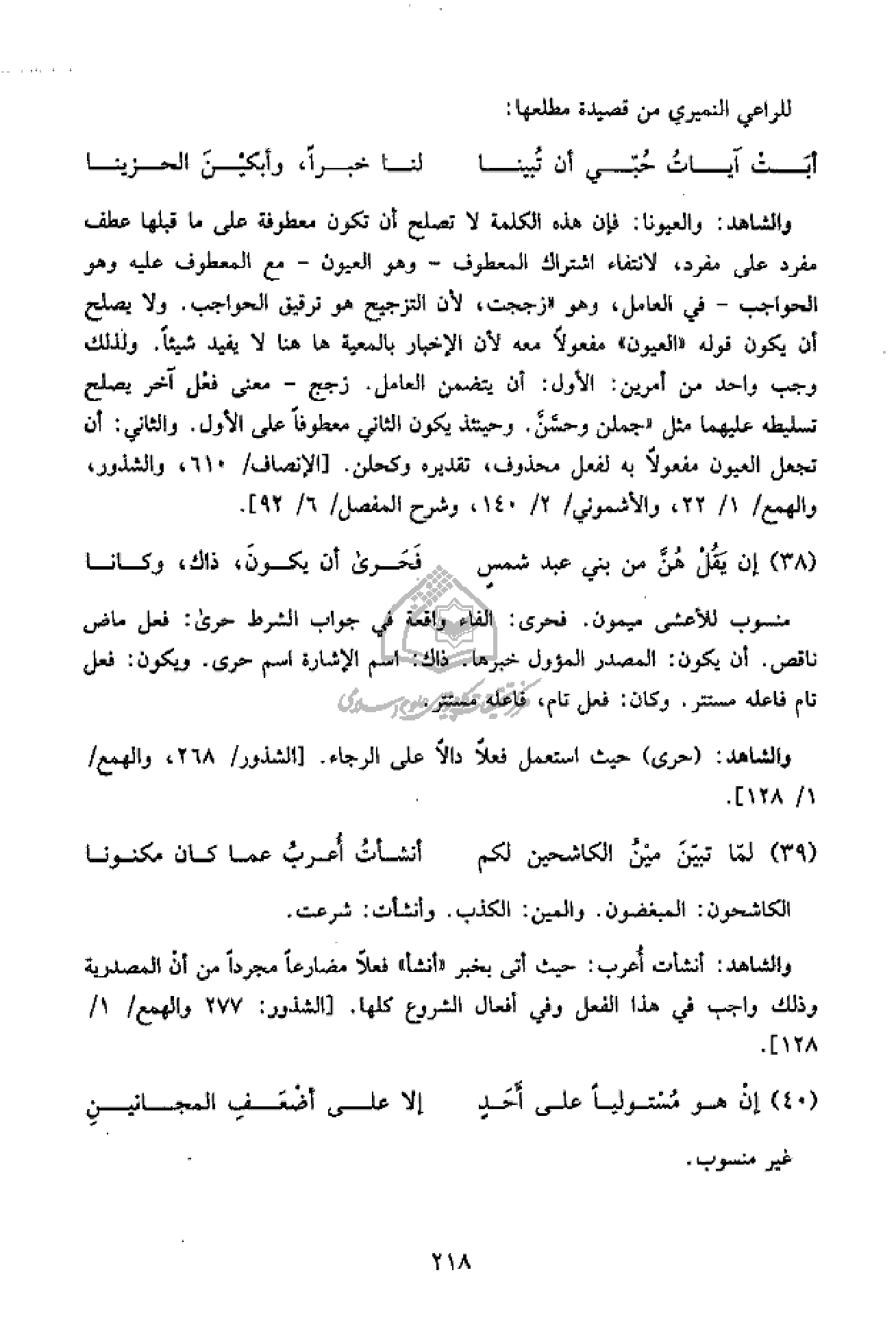 والشاهد: أنشأت أعرب: حيث أتى بخبر «أنشأ» فعلا مضارعا مجردا من أن المصدرية وذلك واجب في هذا الفعل وفي أفعال الشروع كلها. [الشذور: 277 والهمع/ 1/ 128].