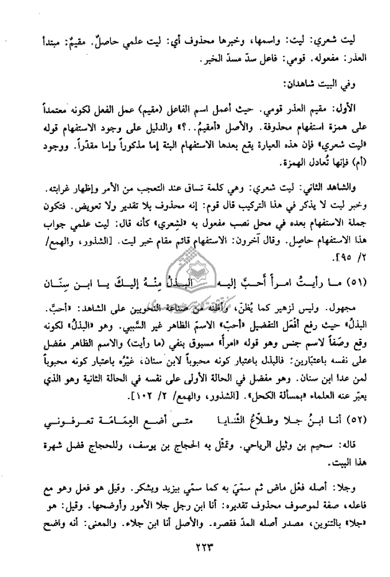 الأول: مقيم العذر قومي. حيث أعمل اسم الفاعل (مقيم) عمل الفعل لكونه معتمدا على همزة استفهام محذوفة. والأصل «أمقيم .. ؟» والدليل على وجود الاستفهام قوله «ليت شعري» فإن هذه العبارة يقع بعدها الاستفهام البتة إما مذكورا وإما مقدّرا. ووجود (أم) فإنها تعادل الهمزة.