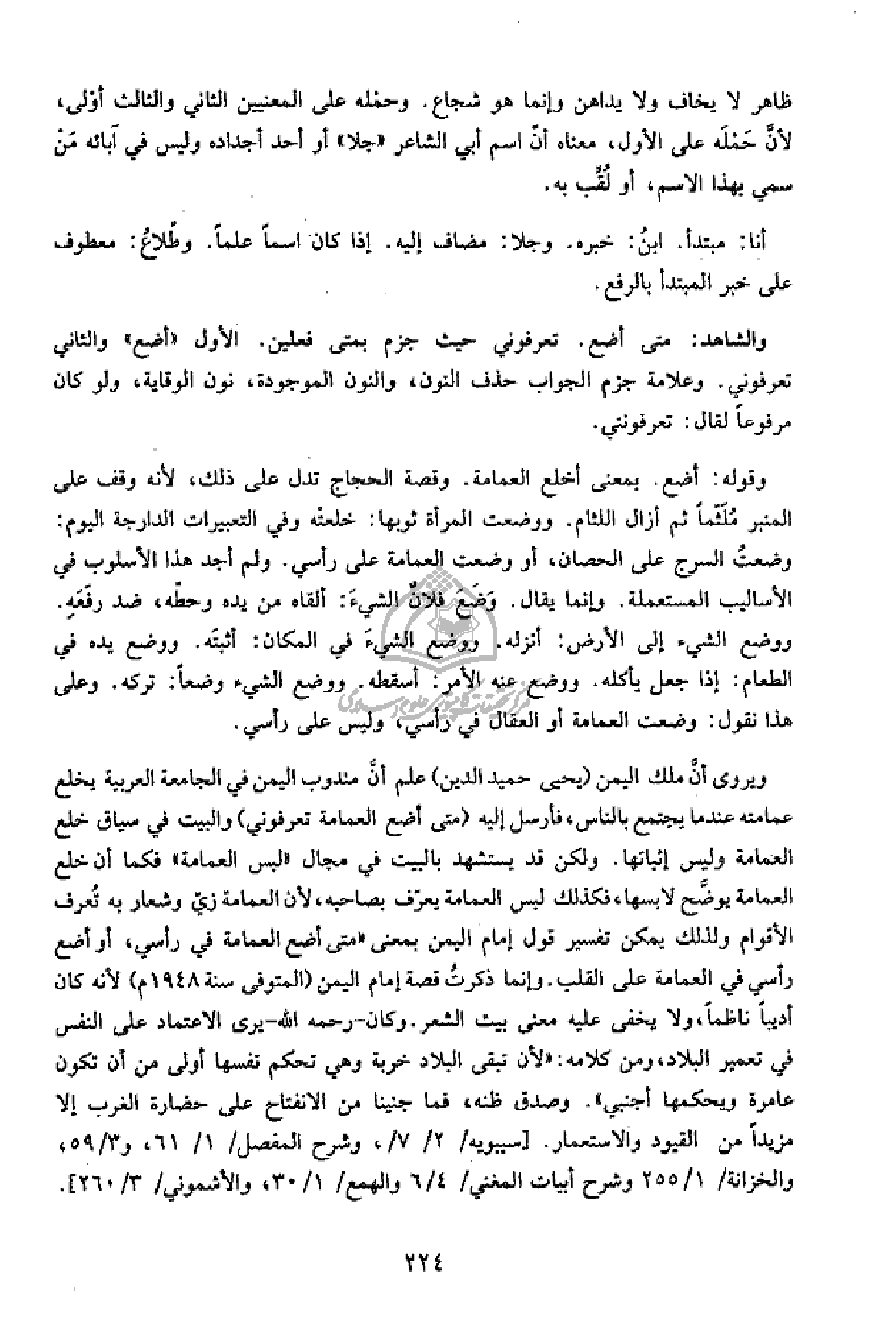 ويروى أنّ ملك اليمن (يحيى حميد الدين) علم أنّ مندوب اليمن في الجامعة العربية يخلع عمامته عند ما يجتمع بالناس، فأرسل إليه (متى أضع العمامة تعرفوني) والبيت في سياق خلع العمامة وليس إثباتها. ولكن قد يستشهد بالبيت في مجال «لبس العمامة» فكما أن خلع العمامة يوضّح لابسها، فكذلك لبس العمامة يعرّف بصاحبه، لأن العمامة زيّ وشعار به تعرف الأقوام ولذلك يمكن تفسير قول إمام اليمن بمعنى «متى أضع العمامة في رأسي، أو أضع رأسي في العمامة على القلب. وإنما ذكرت قصة إمام اليمن (المتوفى سنة 1948 م) لأنه كان أديبا ناظما، ولا يخفى عليه معنى بيت الشعر. وكان - رحمه الله - يرى الاعتماد على النفس في تعمير البلاد، ومن كلامه: «لأن تبقى البلاد خربة وهي تحكم نفسها أولى من أن تكون عامرة ويحكمها أجنبي». وصدق ظنه، فما جنينا من الانفتاح على حضارة الغرب إلا مزيدا من القيود والاستعمار. [سيبويه/ 2/ 7 /، وشرح المفصل/ 1/ 61، و 3/ 59، والخزانة/ 1/ 255 وشرح أبيات المغني/ 4/ 6 والهمع/ 1/ 30، والأشموني/ 3/ 260].