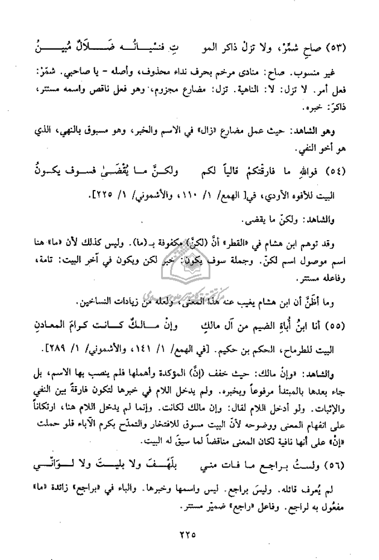 والشاهد: «وإن مالك: حيث خفف (إنّ) المؤكدة وأهملها فلم ينصب بها الاسم، بل جاء بعدها بالمبتدأ مرفوعا وبخبره. ولم يدخل اللام في خبرها لتكون فارقة بين النفي والإثبات. ولو أدخل اللام لقال: وإن مالك لكانت. وإنما لم يدخل اللام هنا، ارتكانا على انفهام المعنى ووضوحه لأنّ البيت مسوق للافتخار والتمدّح بكرم الآباء فلو حملت «إن» على أنها نافية لكان المعنى مناقضا لما سيق له البيت.