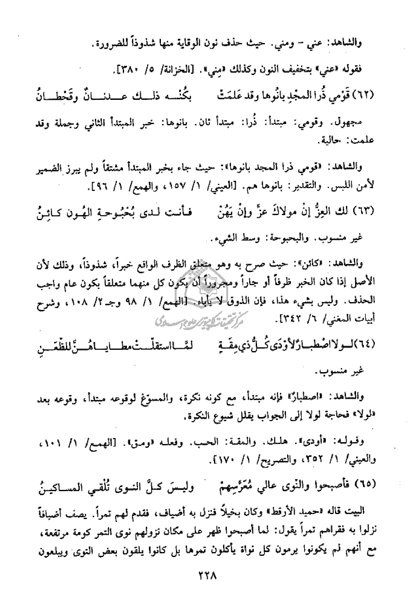 والشاهد: «كائن»: حيث صرح به وهو متعلق الظرف الواقع خبرا، شذوذا، وذلك لأن الأصل إذا كان الخبر ظرفا أو جارا ومجرورا أن يكون كل منهما متعلقا بكون عام واجب الحذف. وليس بشيء هذا، فإن الذوق لا يأباه. [الهمع/ 1/ 98 وج 2/ 108، وشرح أبيات المغني/ 6/ 342].