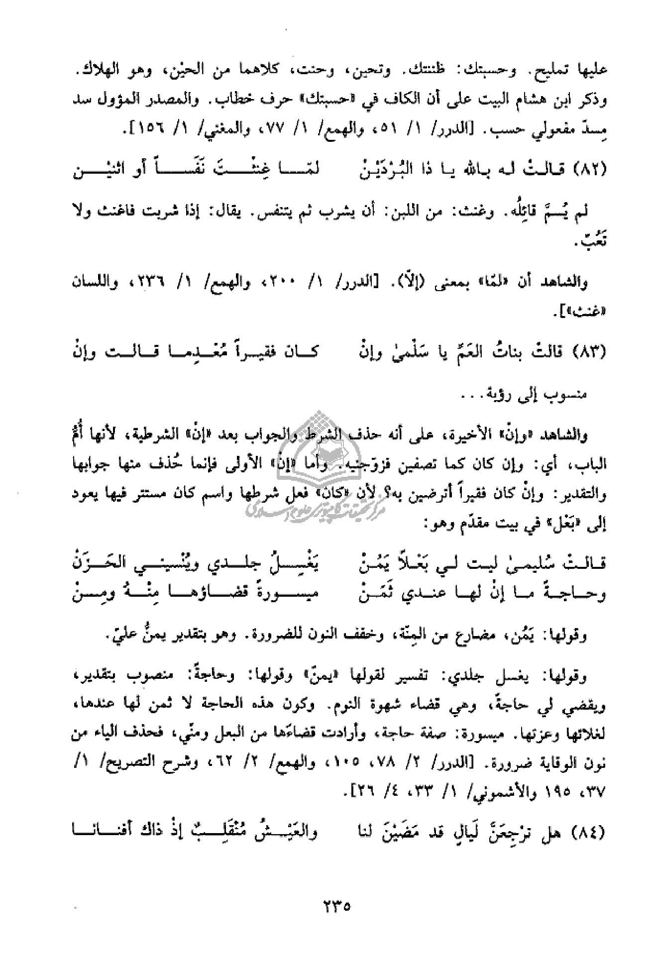 وقولها: يغسل جلدي: تفسير لقولها «يمنّ» وقولها: وحاجة: منصوب بتقدير، ويقضي لي حاجة، وهي قضاء شهوة النوم. وكون هذه الحاجة لا ثمن لها عندها، لغلائها وعزتها. ميسورة: صفة حاجة، وأرادت قضاءها من البعل ومنّي، فحذف الياء من نون الوقاية ضرورة. [الدرر/ 2/ 78، 105، والهمع/ 2/ 62، وشرح التصريح/ 1/ 37، 195 والأشموني/ 1/ 33، 4/ 26].