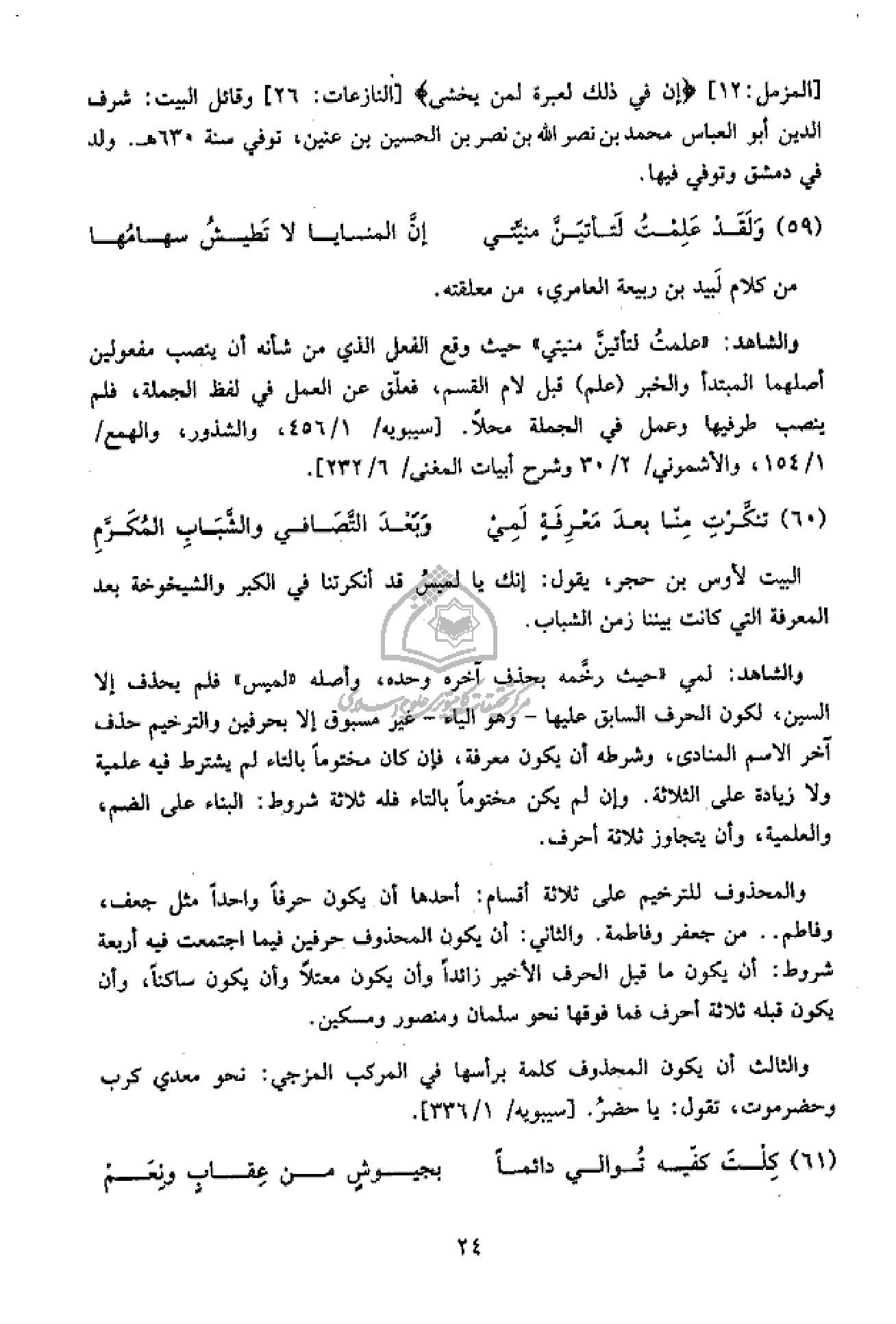 [المزمل: 12] إِنَّ فِي ذلِكَ لَعِبْرَةً لِمَنْ يَخْشى [النازعات: 26] وقائل البيت: شرف الدين أبو العباس محمد بن نصر الله بن نصر بن الحسين بن عنين، توفي سنة 630 هـ. ولد في دمشق وتوفي فيها.