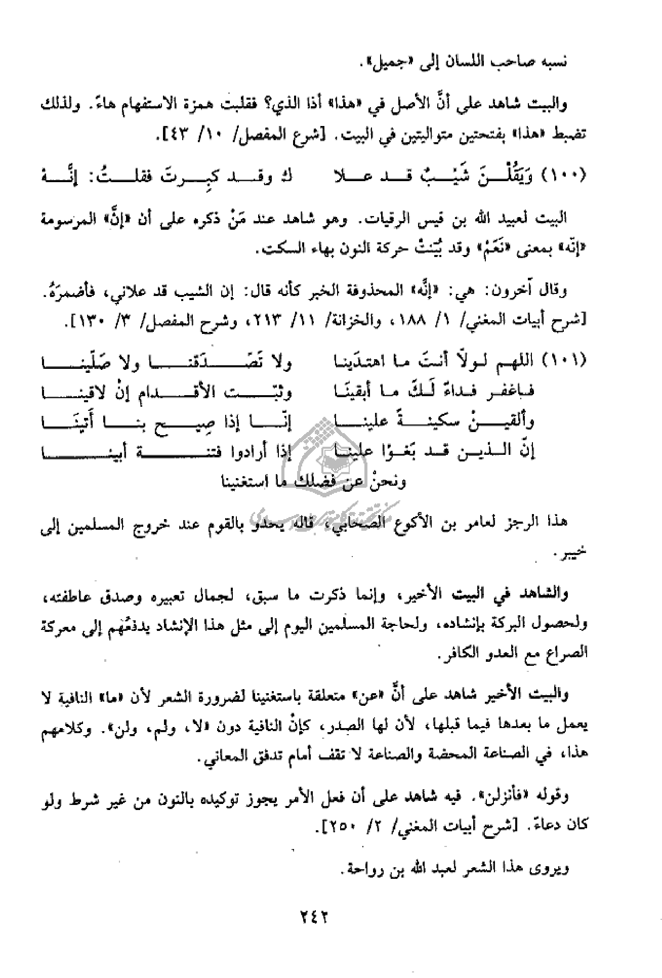 وقوله «فأنزلن». فيه شاهد على أن فعل الأمر يجوز توكيده بالنون من غير شرط ولو كان دعاء. [شرح أبيات المغني/ 2/ 250].