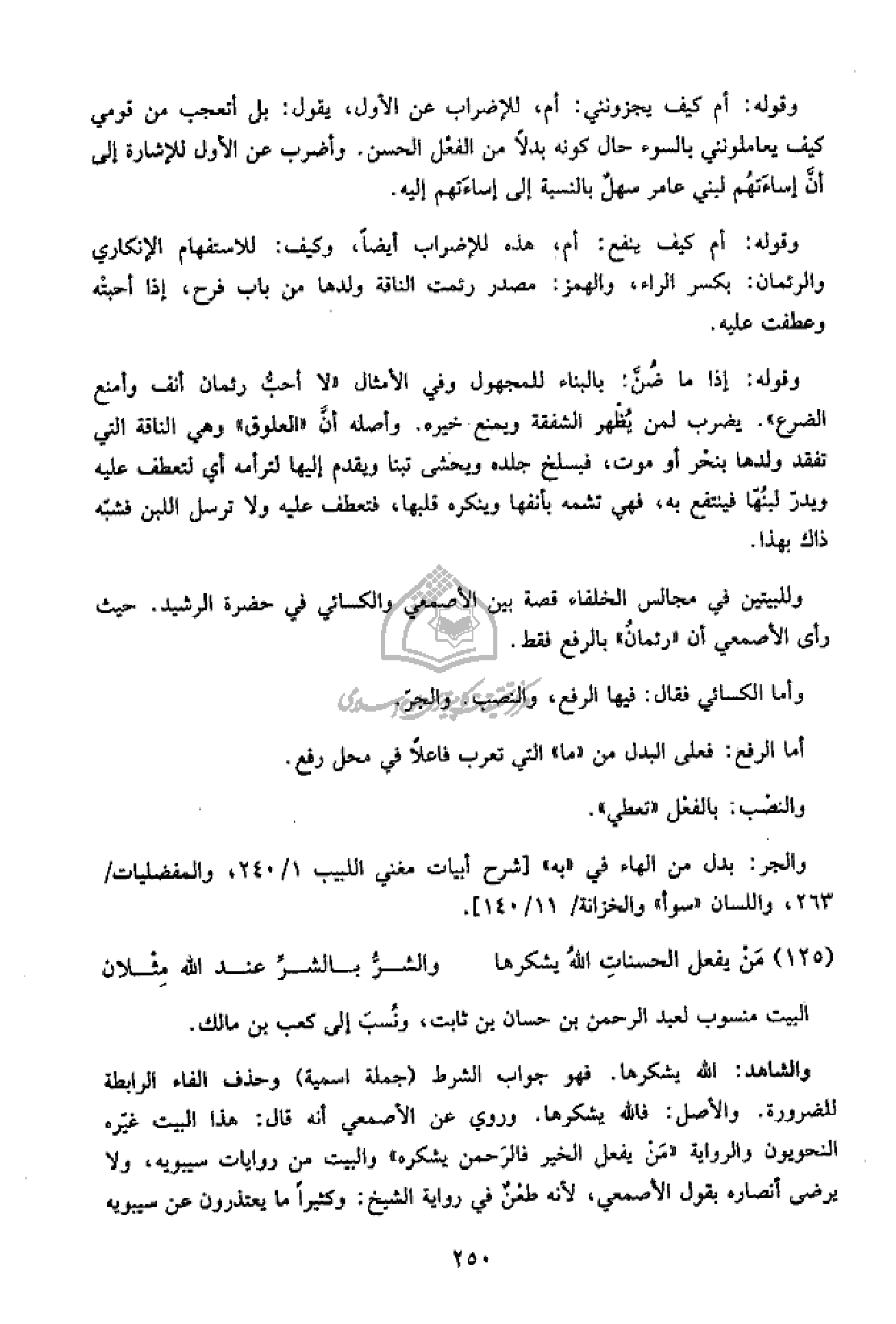 والشاهد: الله يشكرها. فهو جواب الشرط (جملة اسمية) وحذف الفاء الرابطة للضرورة. والأصل: فالله يشكرها. وروي عن الأصمعي أنه قال: هذا البيت غيّره النحويون والرواية «من يفعل الخير فالرحمن يشكره» والبيت من روايات سيبويه، ولا يرضى أنصاره بقول الأصمعي، لأنه طعن في رواية الشيخ: وكثيرا ما يعتذرون عن سيبويه