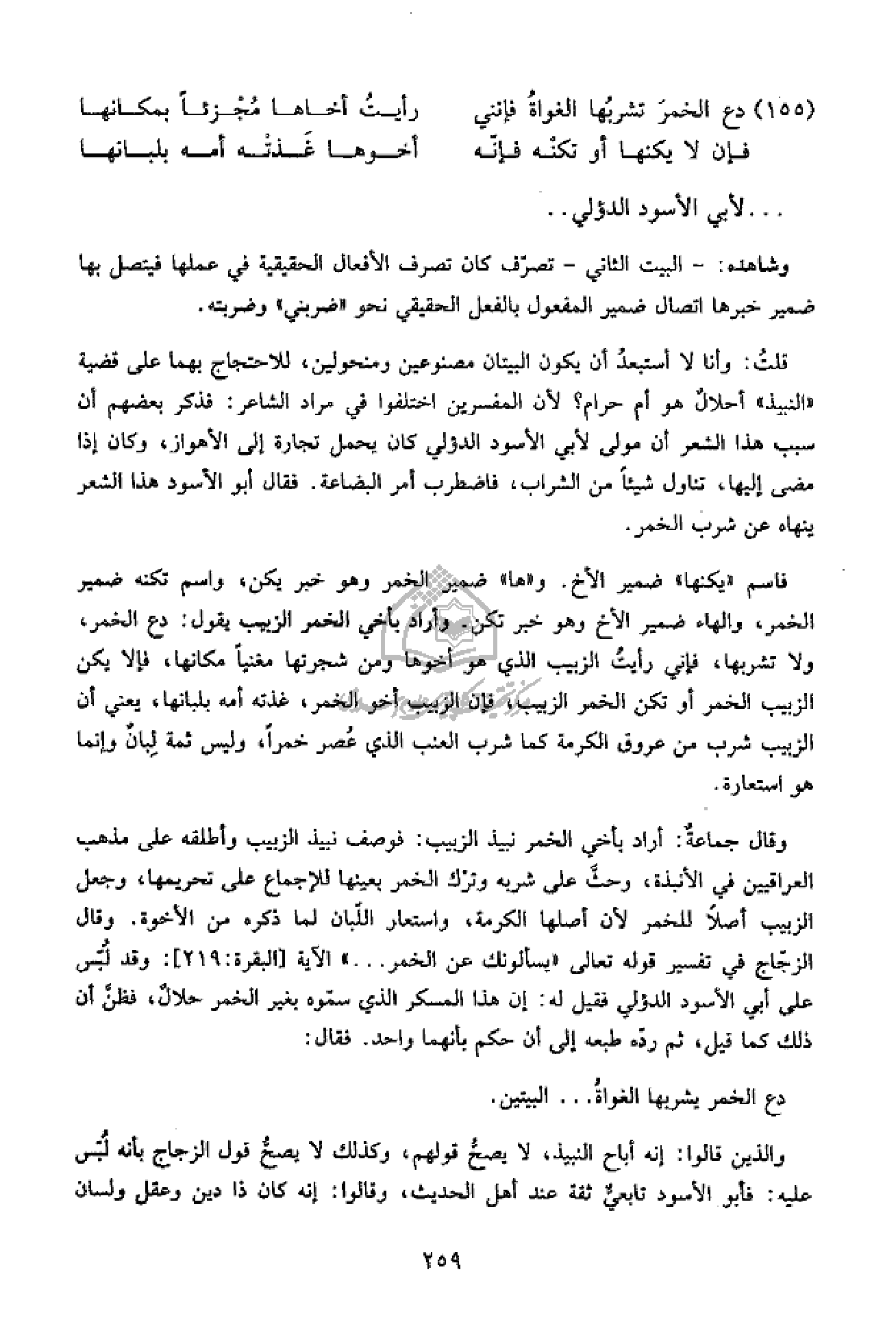 وقال جماعة: أراد بأخي الخمر نبيذ الزبيب: فوصف نبيذ الزبيب وأطلقه على مذهب العراقيين في الأنبذة، وحثّ على شربه وترك الخمر بعينها للإجماع على تحريمها، وجعل الزبيب أصلا للخمر لأن أصلها الكرمة، واستعار اللّبان لما ذكره من الأخوة. وقال الزجّاج في تفسير قوله تعالى «يَسْئَلُونَكَ عَنِ الْخَمْرِ ...» الآية [البقرة: 219]: وقد لبّس على أبي الأسود الدؤلي فقيل له: إن هذا المسكر الذي سمّوه بغير الخمر حلال، فظنّ أن ذلك كما قيل، ثم ردّه طبعه إلى أن حكم بأنهما واحد. فقال: