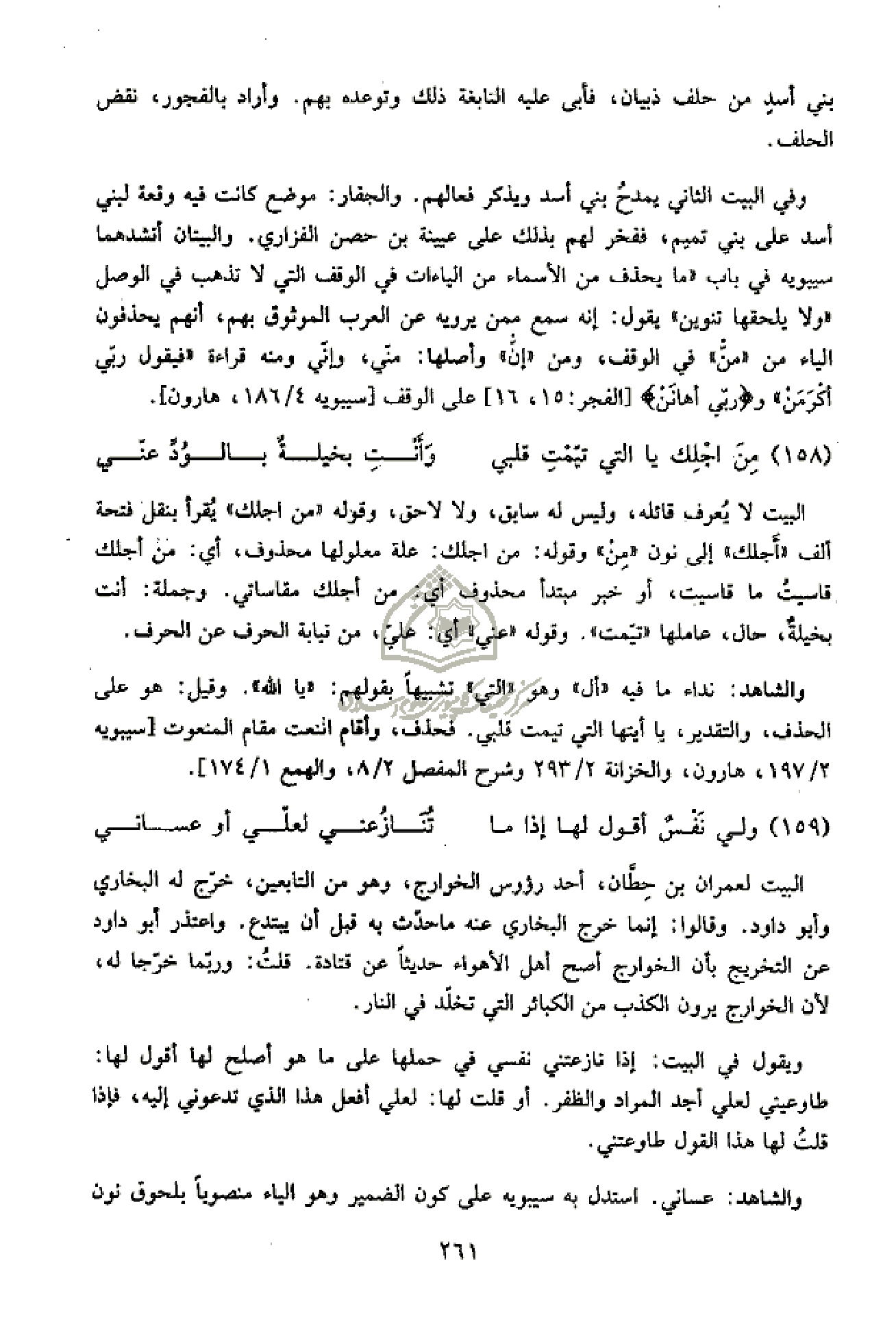 وفي البيت الثاني يمدح بني أسد ويذكر فعالهم. والجفار: موضع كانت فيه وقعة لبني أسد على بني تميم، ففخر لهم بذلك على عيينة بن حصن الفزاري. والبيتان أنشدهما سيبويه في باب «ما يحذف من الأسماء من الياءات في الوقف التي لا تذهب في الوصل «ولا يلحقها تنوين» يقول: إنه سمع ممن يرويه عن العرب الموثوق بهم، أنهم يحذفون الياء من «منّ» في الوقف، ومن «إنّ» وأصلها: منّي، وإنّي ومنه قراءة «فَيَقُولُ رَبِّي أَكْرَمَنِ» ورَبِّي أَهانَنِ [الفجر: 15، 16] على الوقف [سيبويه 4/ 186، هارون].
