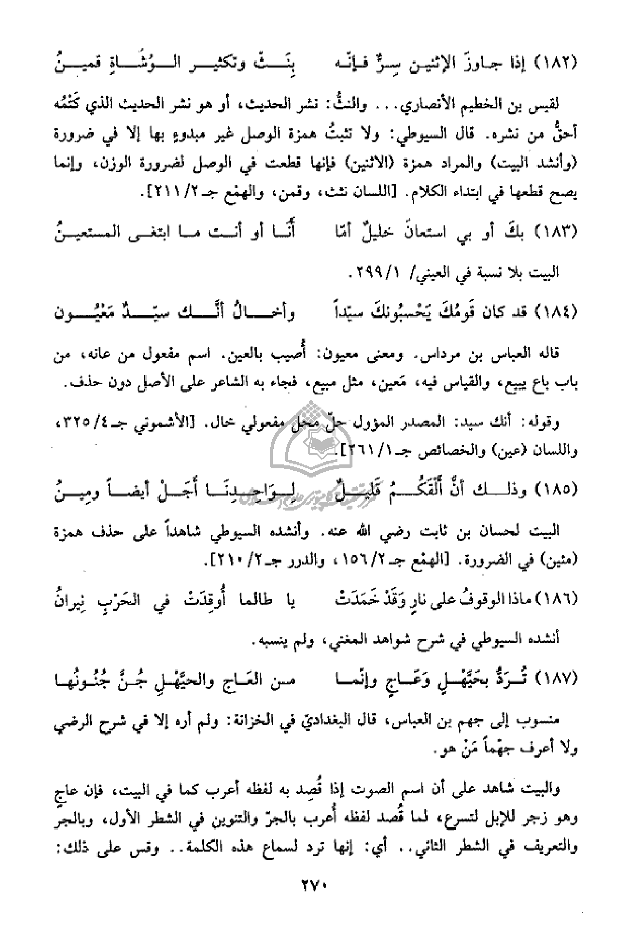 لقيس بن الخطيم الأنصاري ... والنثّ: نشر الحديث، أو هو نشر الحديث الذي كتمه أحقّ من نشره. قال السيوطي: ولا تثبت همزة الوصل غير مبدوء بها إلا في ضرورة (وأنشد البيت) والمراد همزة (الاثنين) فإنها قطعت في الوصل لضرورة الوزن، وإنما يصح قطعها في ابتداء الكلام. [اللسان نثث، وقمن، والهمع ج 2/ 211].