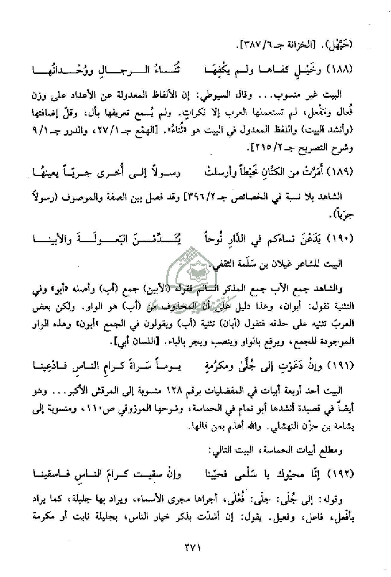 البيت غير منسوب ... وقال السيوطي: إن الألفاظ المعدولة عن الأعداد على وزن فعال ومفعل، لم تستعملها العرب إلا نكرات. ولم يسمع تعريفها بأل، وقلّ إضافتها (وأنشد البيت) واللفظ المعدول في البيت هو «ثناء». [الهمع ج 1/ 27، والدرر ج 1/ 9 وشرح التصريح ج 2/ 215].