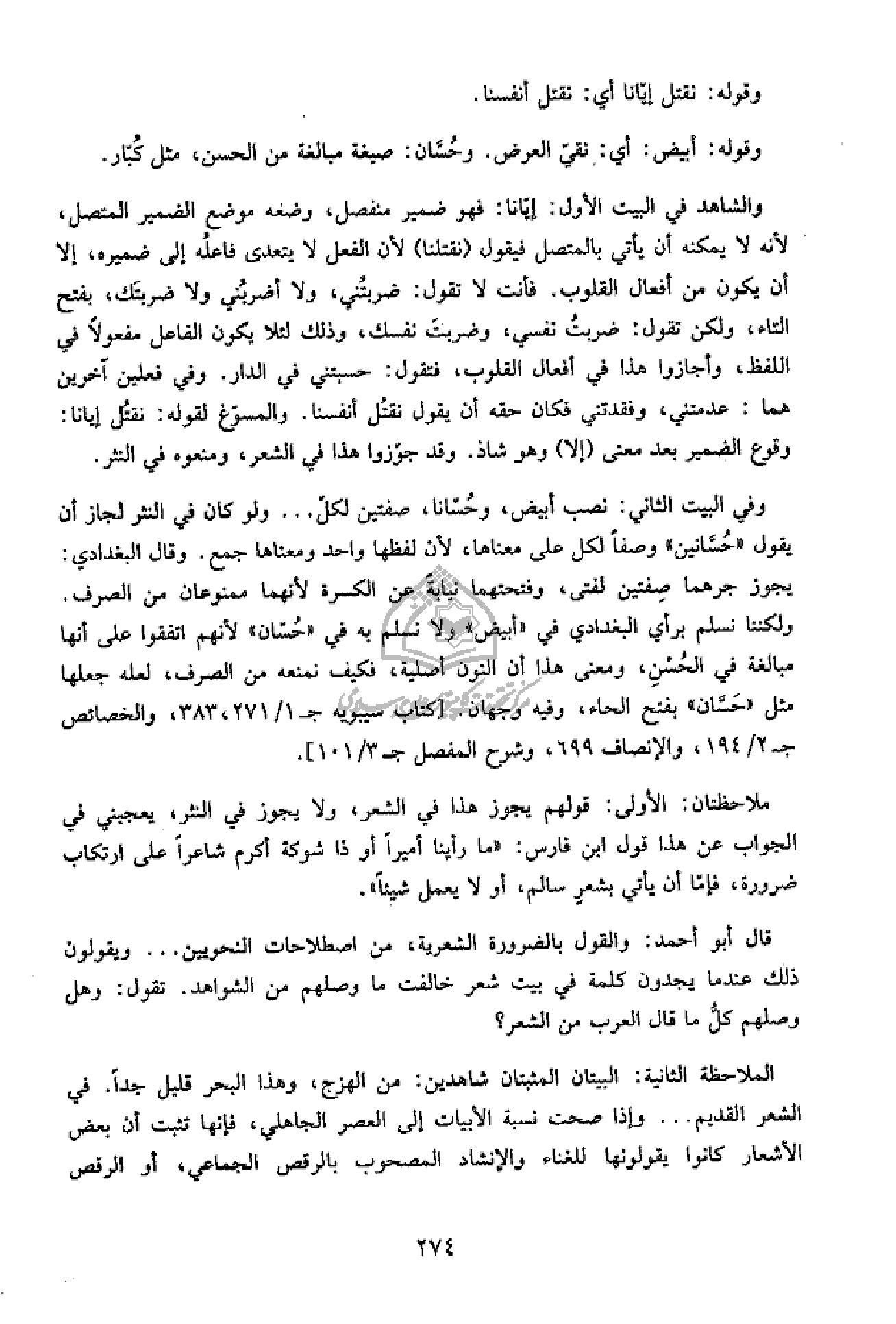 وفي البيت الثاني: نصب أبيض، وحسّانا، صفتين لكلّ ... ولو كان في النثر لجاز أن يقول «حسّانين» وصفا لكل على معناها، لأن لفظها واحد ومعناها جمع. وقال البغدادي: