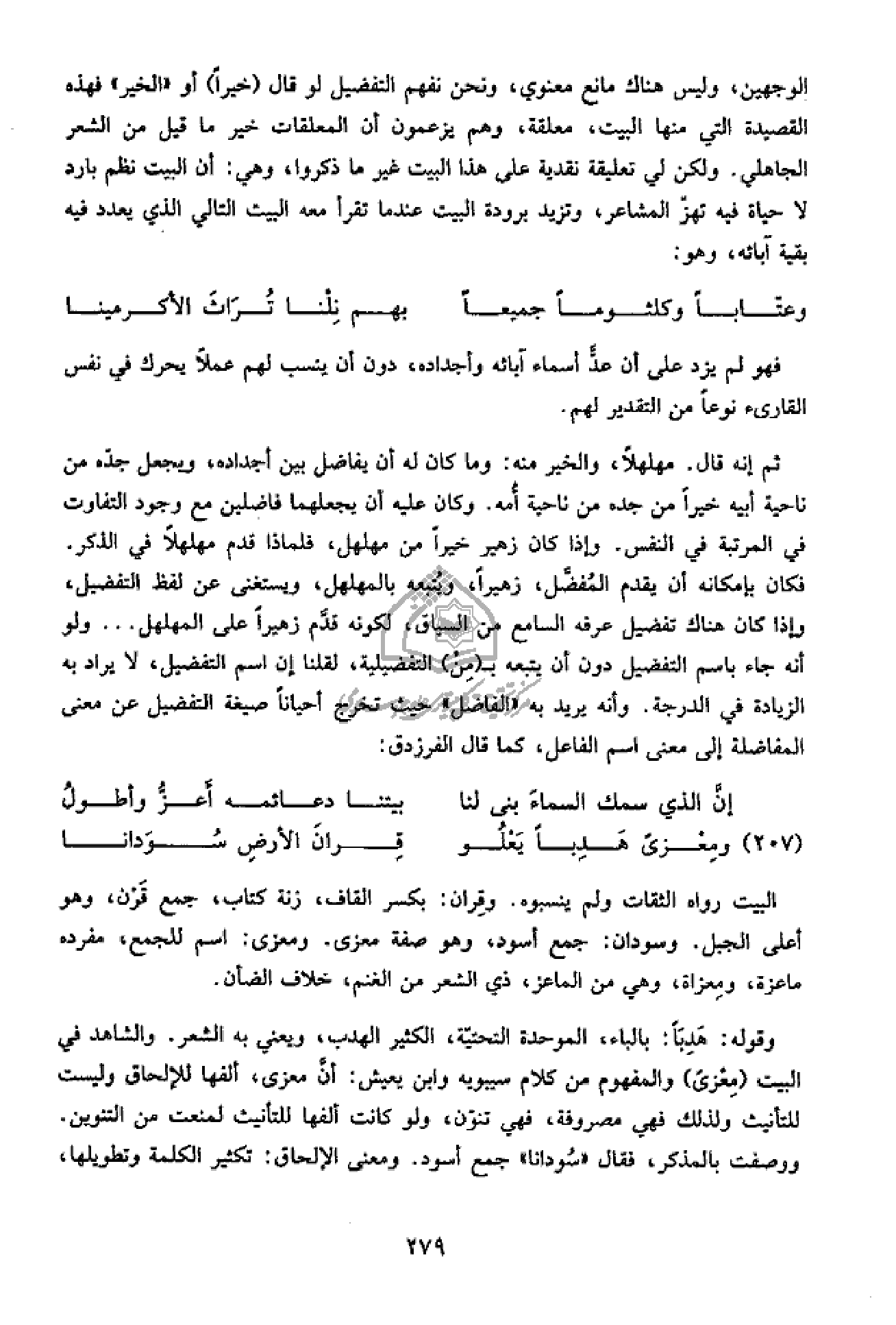 فكان بإمكانه أن يقدم المفضّل، زهيرا، ويتبعه بالمهلهل، ويستغنى عن لفظ التفضيل، وإذا كان هناك تفضيل عرفه السامع من السياق، لكونه قدّم زهيرا على المهلهل ... ولو أنه جاء باسم التفضيل دون أن يتبعه ب (من) التفضيلية، لقلنا إن اسم التفضيل، لا يراد به الزيادة في الدرجة. وأنه يريد به «الفاضل» حيث تخرج أحيانا صيغة