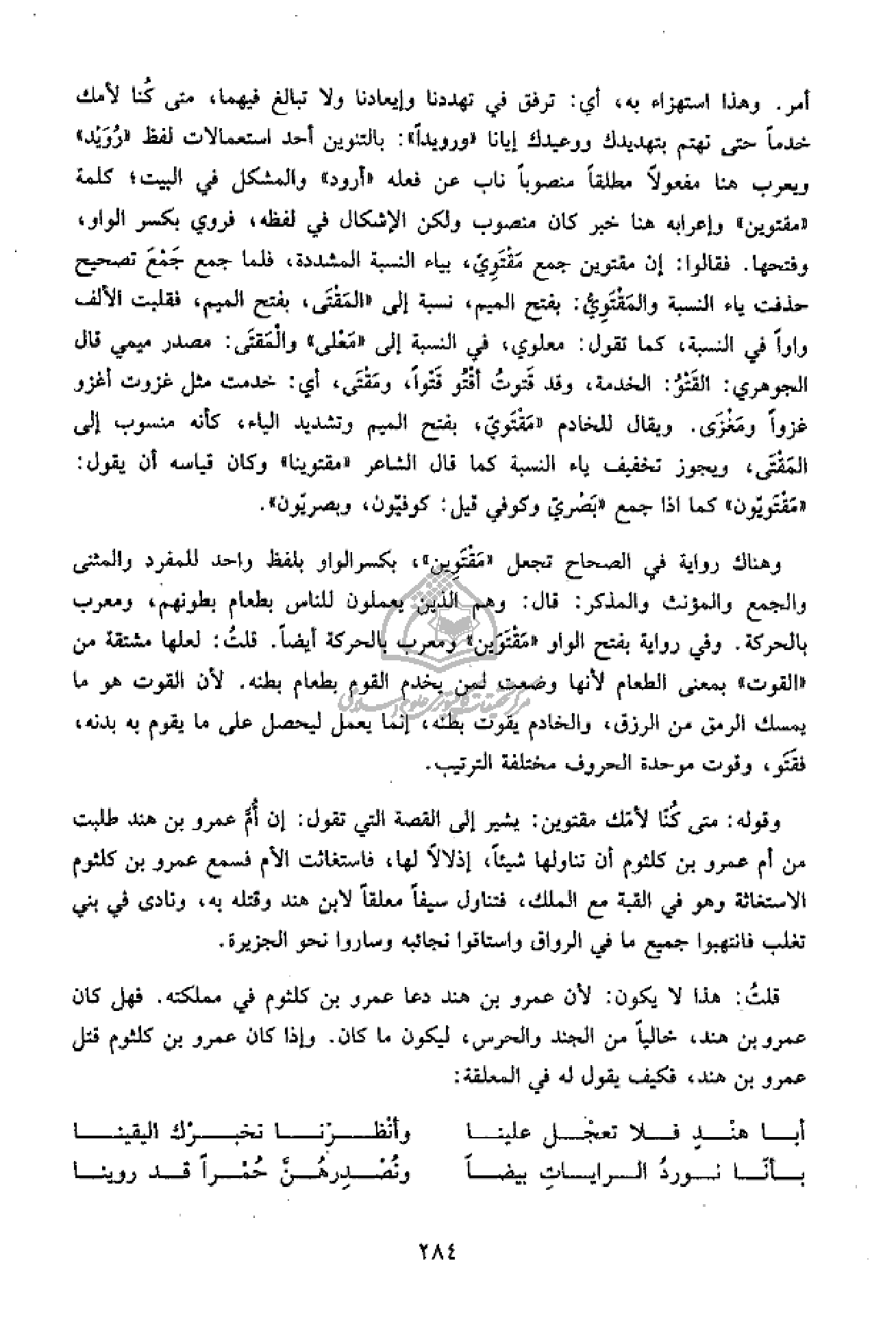 أمر. وهذا استهزاء به، أي: ترفق في تهددنا وإيعادنا ولا تبالغ فيهما، متى كنا لأمك خدما حتى نهتم بتهديدك ووعيدك إيانا «ورويدا»: بالتنوين أحد استعمالات لفظ «رويد» ويعرب هنا مفعولا مطلقا منصوبا ناب عن فعله «أرود» والمشكل في البيت؛ كلمة «مقتوين» وإعرابه هنا خبر كان منصوب ولكن الإشكال في لفظه، فروي بكسر الواو، وفتحها. فقالوا: إن مقتوين جمع مقتويّ، بياء النسبة المشددة، فلما جمع جمع تصحيح حذفت ياء النسبة