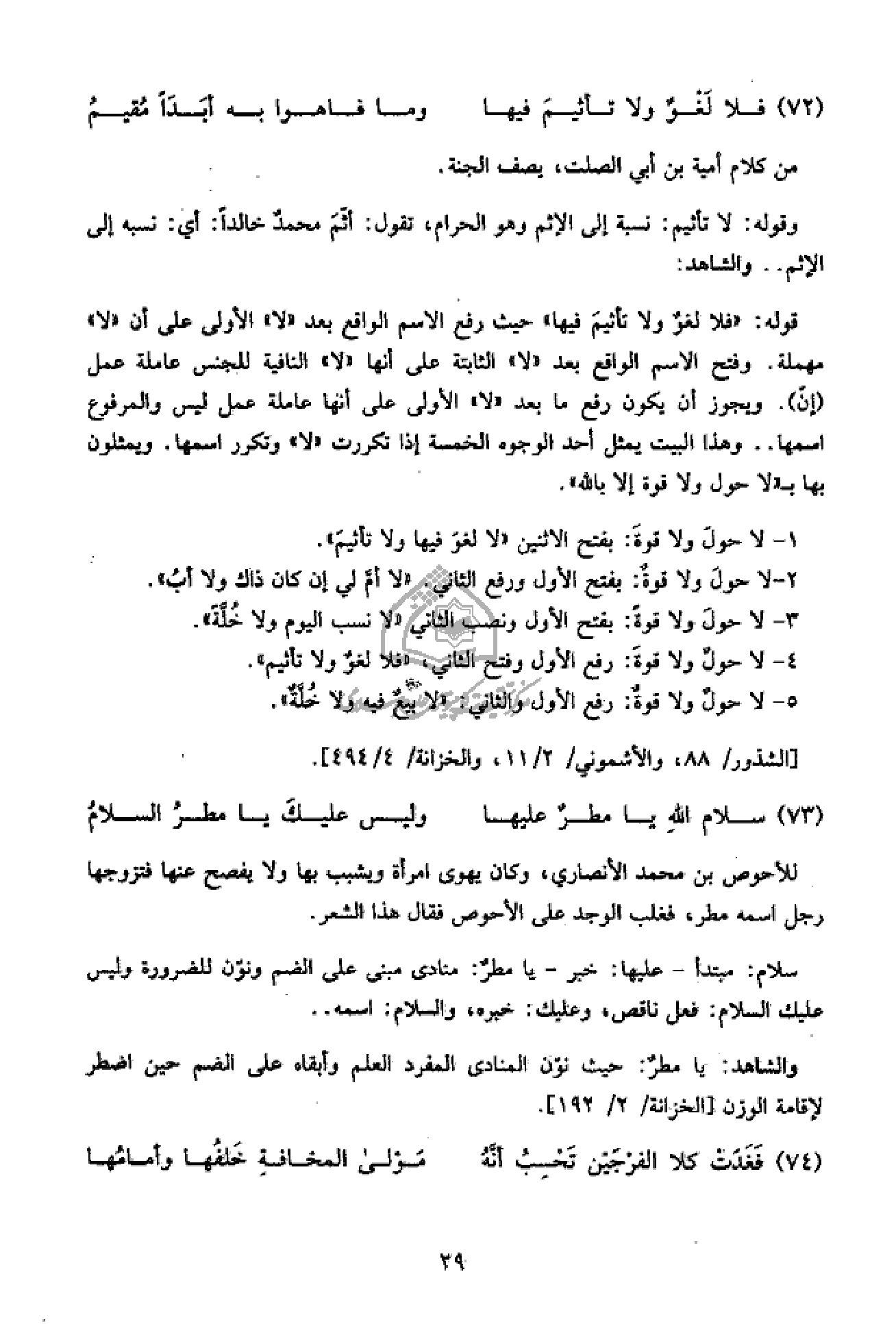 قوله: «فلا لغو ولا تأثيم فيها» حيث رفع الاسم الواقع بعد «لا» الأولى على أن «لا» مهملة. وفتح الاسم الواقع بعد «لا» الثابتة على أنها «لا» النافية للجنس عاملة عمل (إنّ). ويجوز أن يكون رفع ما بعد «لا» الأولى على أنها عاملة عمل ليس والمرفوع اسمها .. وهذا البيت يمثل أحد الوجوه الخمسة إذا تكررت «لا» وتكرر اسمها. ويمثلون بها ب «لا حول ولا قوة إلا بالله».