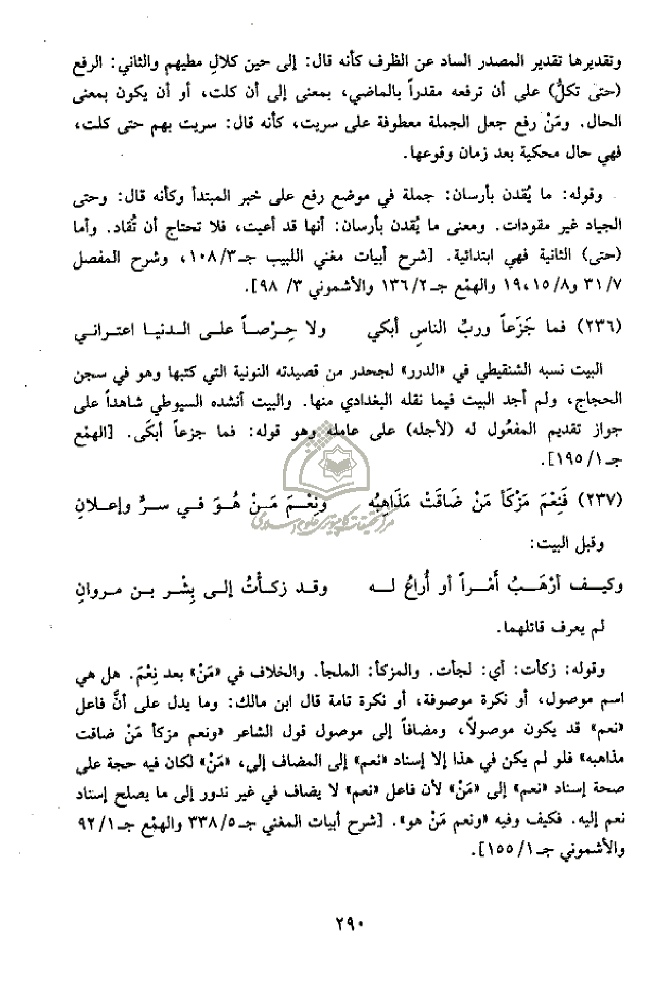 نعم مزكأ من ضاقت مذاهبه» فلو لم يكن في هذا إلا إسناد «نعم» إلى المضاف إلى، «من» لكان فيه حجة على صحة إسناد «نعم» إلى «من» لأن فاعل «نعم» لا يضاف في غير ندور إلى ما يصلح إسناد نعم إليه. فكيف وفيه «ونعم من هو». [شرح أبيات المغني ج 5/ 338 والهمع ج 1/ 92 والأشموني ج 1/ 155].