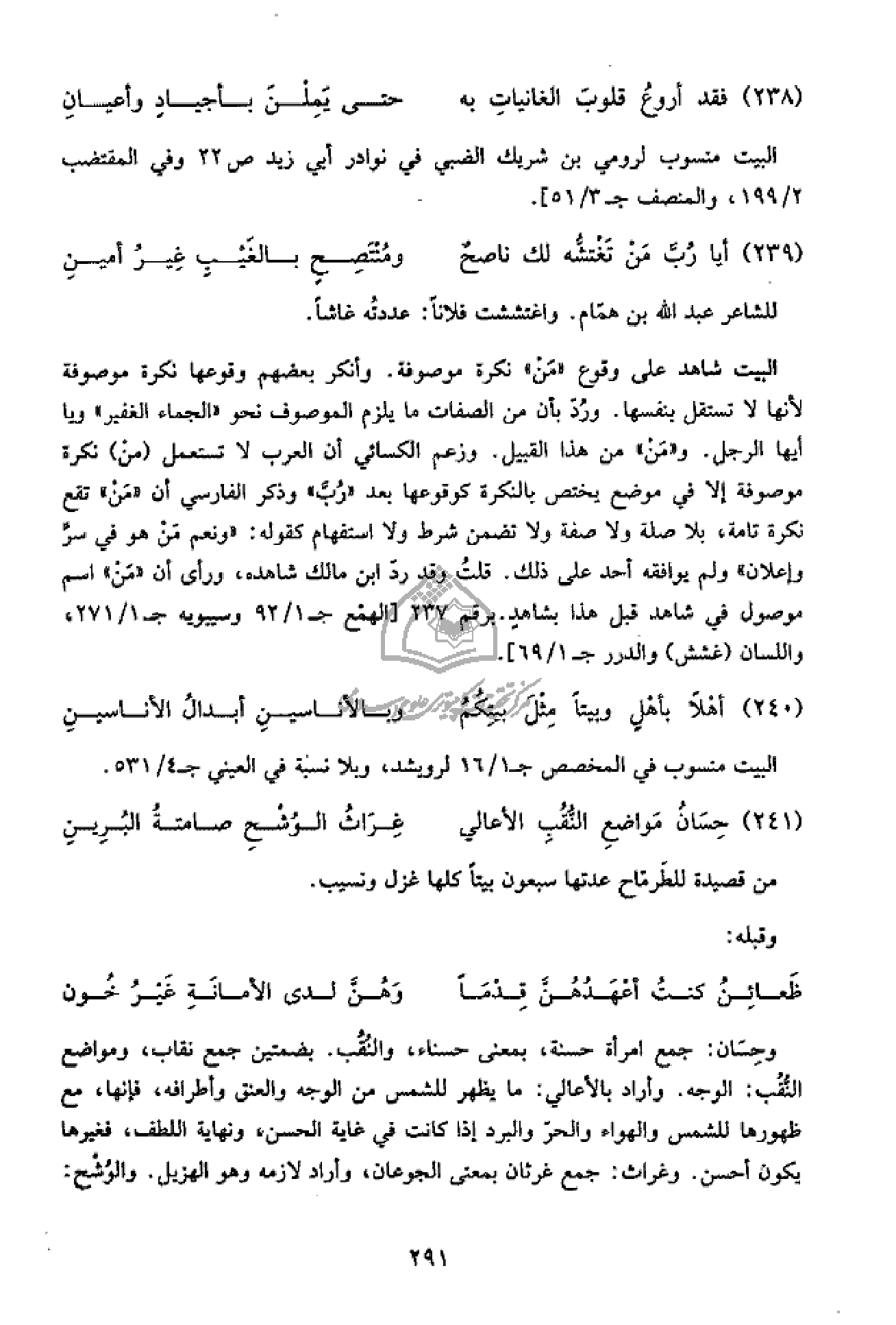 البيت شاهد على وقوع «من» نكرة موصوفة. وأنكر بعضهم وقوعها نكرة موصوفة لأنها لا تستقل بنفسها. وردّ بأن من الصفات ما يلزم الموصوف نحو «الجماء الغفير» ويا أيها الرجل. و «من» من هذا القبيل. وزعم الكسائي أن العرب لا تستعمل (من) نكرة موصوفة إلا في موضع يختص بالنكرة كوقوعها بعد «ربّ» وذكر الفارسي أن «من» تقع نكرة تامة، بلا صلة ولا صفة ولا تضمن شرط ولا استفهام كقوله: «ونعم من هو في سرّ وإعلان» ولم يوافقه أحد على ذلك. قلت وقد ردّ ابن مالك شاهده، ورأى أن «من» اسم موصول في شاهد قبل هذا بشاهد. برقم 237 [الهمع ج 1/ 92 وسيبويه ج 1/ 271، واللسان (غشش) والدرر ج 1/ 69].