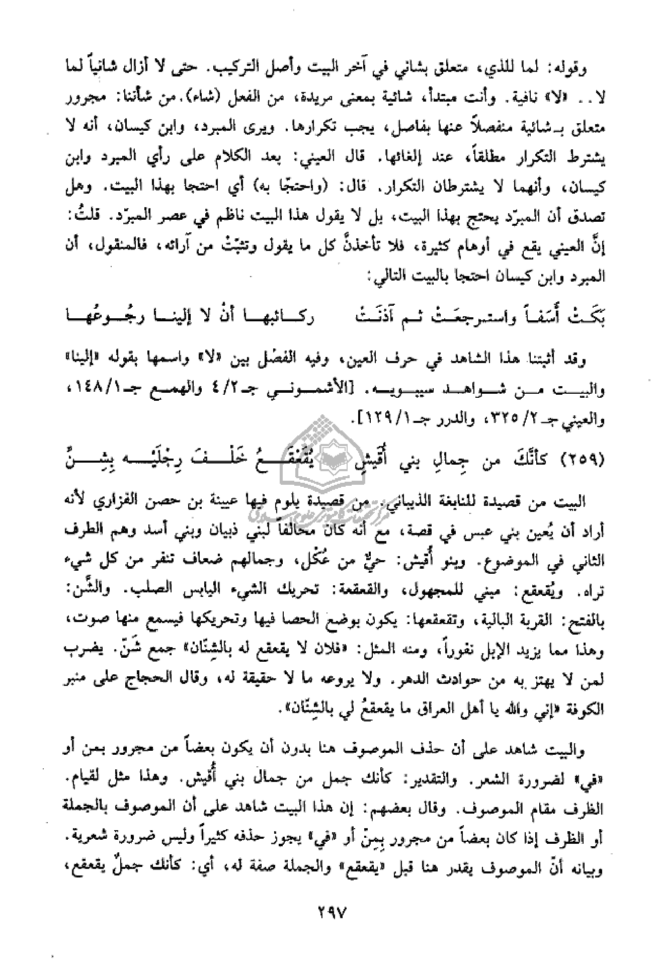 وقوله: لما للذي، متعلق بشاني في آخر البيت وأصل التركيب. حتى لا أزال شانيا لما لا .. «لا» نافية. وأنت مبتدأ، شائية بمعنى مريدة، من الفعل (شاء). من شأننا: مجرور متعلق ب شائية منفصلا عنها بفاصل، يجب تكرارها. ويرى المبرد، وابن كيسان، أنه لا يشترط التكرار مطلقا، عند إلغائها. قال العيني: بعد الكلام على رأي المبرد وابن كيسان، وأنهما لا يشترطان التكرار. قال: (واحتجّا به) أي احتجا بهذا البيت. وهل تصدق أن المبرّد يحتج بهذا البيت، بل لا يقول هذا البيت ناظم في عصر المبرّد. قلت: