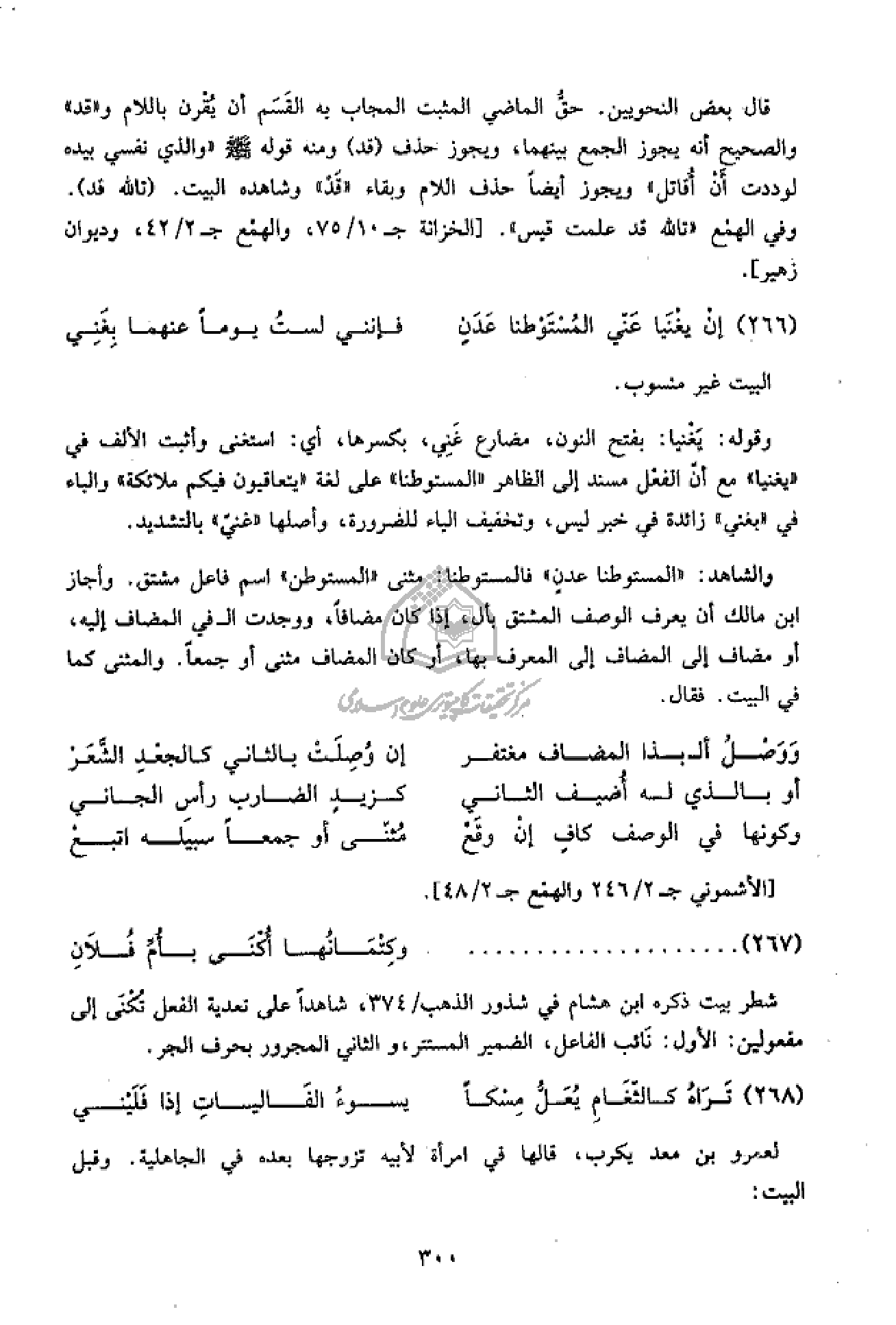والشاهد: «المستوطنا عدن» فالمستوطنا: مثنى «المستوطن» اسم فاعل مشتق. وأجاز ابن مالك أن يعرف الوصف المشتق بأل، إذا كان مضافا، ووجدت ال في المضاف إليه، أو مضاف إلى المضاف إلى المعرف بها، أو كان المضاف مثنى أو جمعا. والمثنى كما في البيت. فقال.