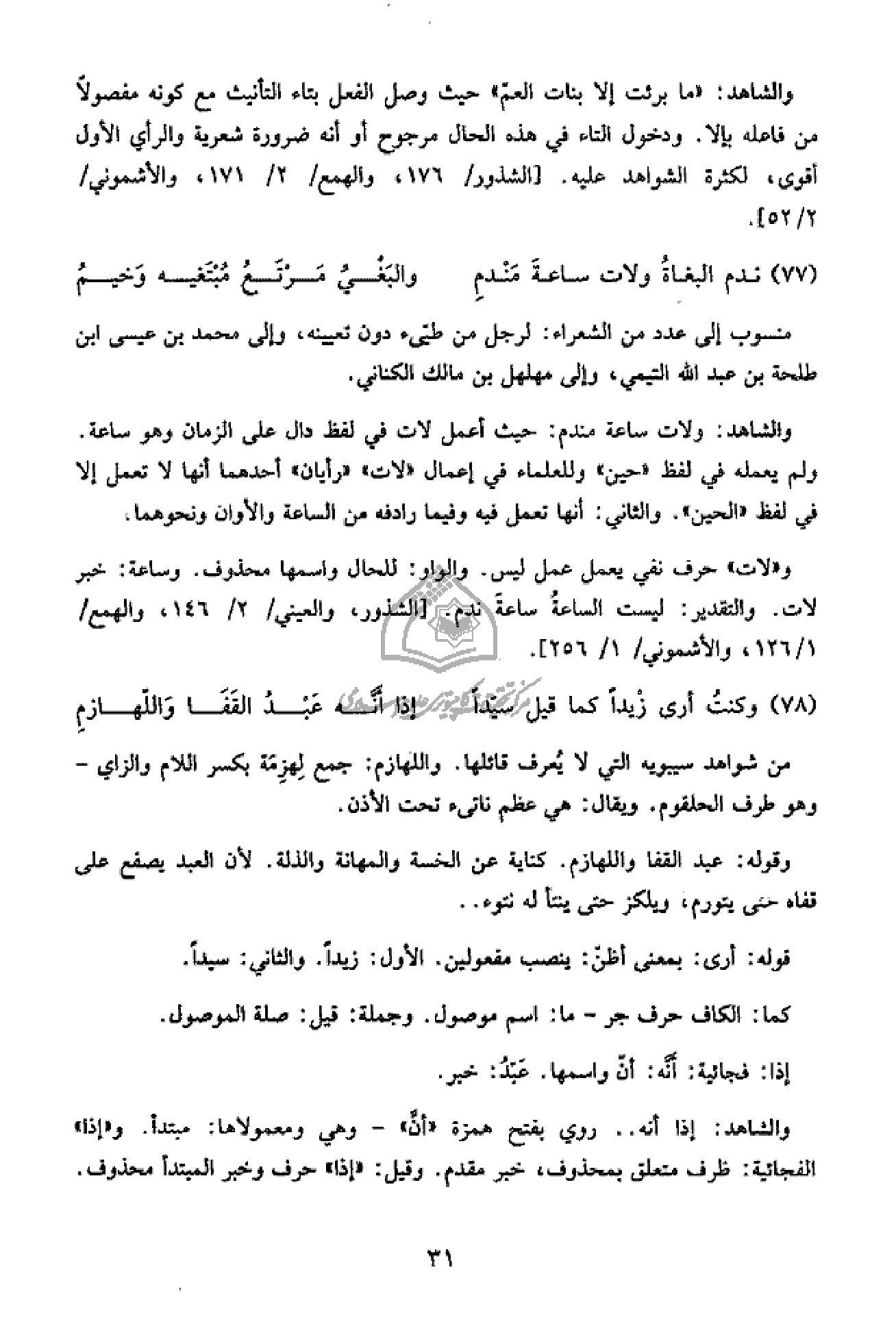 والشاهد: «ما برئت إلا بنات العمّ» حيث وصل الفعل بتاء التأنيث مع كونه مفصولا من فاعله بإلا. ودخول التاء في هذه الحال مرجوح أو أنه ضرورة شعرية والرأي الأول أقوى، لكثرة الشواهد عليه. [الشذور/ 176، والهمع/ 2/ 171، والأشموني/ 2/ 52].