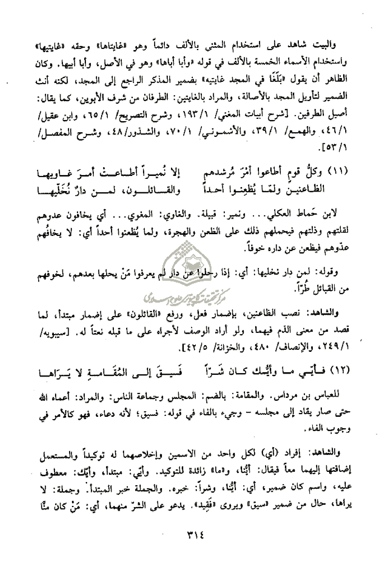 والبيت شاهد على استخدام المثنى بالألف دائما وهو «غايتاها» وحقه «غايتيها» واستخدام الأسماء الخمسة بالألف في قوله «وأبا أباها» وهو في الأصل، وأبا أبيها. وكان الظاهر أن يقول «بلغا في المجد غايتيه» بضمير المذكر الراجع إلى المجد، لكنه أنث الضمير لتأويل المجد بالأصالة، والمراد بالغايتين: الطرفان من شرف الأبوين، كما يقال: