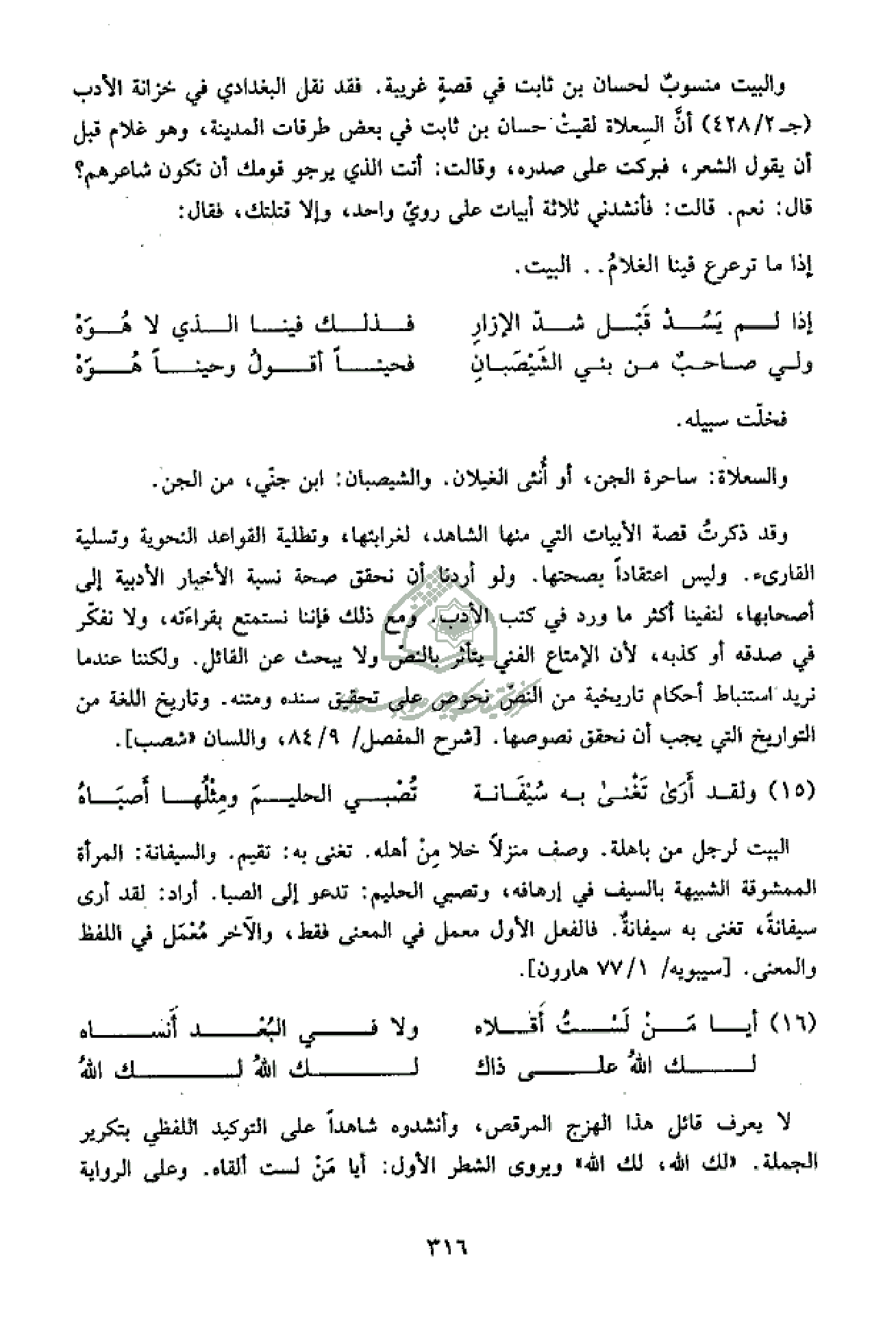 وقد ذكرت قصة الأبيات التي منها الشاهد، لغرابتها، وتطلية القواعد النحوية وتسلية القارئ. وليس اعتقادا بصحتها. ولو أردنا أن نحقق صحة نسبة الأخبار الأدبية إلى أصحابها، لنفينا أكثر ما ورد في كتب الأدب. ومع ذلك فإننا نستمتع بقراءته، ولا نفكّر في صدقه أو كذبه، لأن الإمتاع الفني يتأثر بالنصّ ولا يبحث عن القائل. ولكننا عند ما نريد استنباط أحكام تاريخية من النصّ نحرص على تحقيق سنده ومتنه. وتاريخ اللغة من التواريخ التي يجب أن نحقق نصوصها. [شرح المفصل/ 9/ 84، واللسان «شصب].