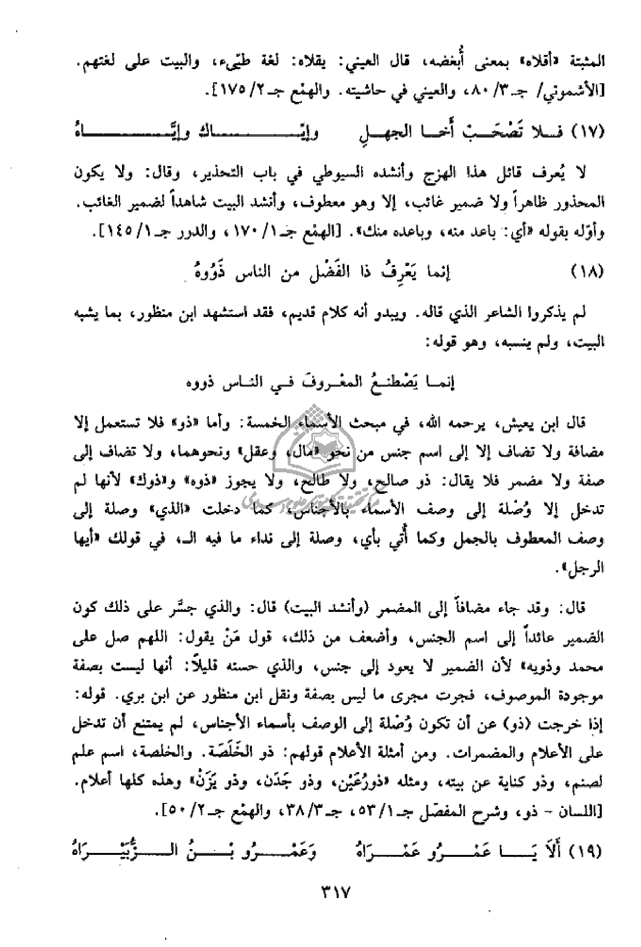 قال: وقد جاء مضافا إلى المضمر (وأنشد البيت) قال: والذي جسّر على ذلك كون الضمير عائدا إلى اسم الجنس، وأضعف من ذلك، قول من يقول: اللهم صل على محمد وذويه» لأن الضمير لا يعود إلى جنس، والذي حسنه قليلا: أنها ليست بصفة موجودة الموصوف، فجرت مجرى ما ليس بصفة ونقل ابن منظور عن ابن بري. قوله: