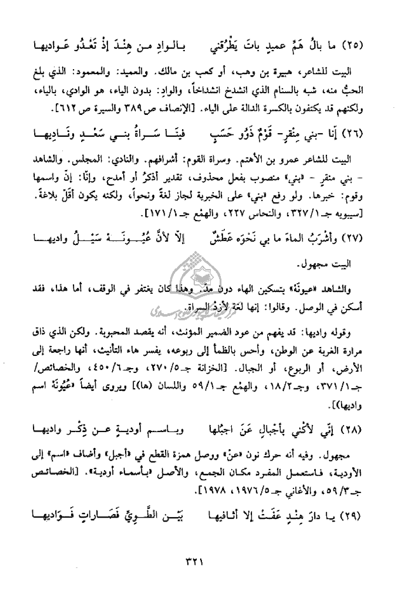 البيت للشاعر، هبيرة بن وهب، أو كعب بن مالك. والعميد: والمعمود: الذي بلغ الحبّ منه، شبه بالسنام الذي انشدخ انشداخا، والواد: بدون الياء، هو الوادي، بالياء، ولكنهم قد يكتفون بالكسرة الدالة على الياء. [الإنصاف ص 389 والسيرة ص 612].