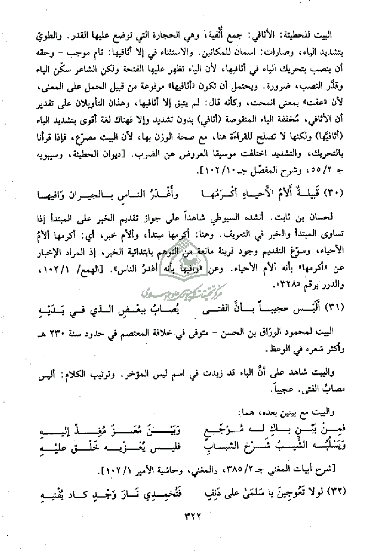 البيت للحطيئة: الأثافي: جمع أثفية، وهي الحجارة التي توضع عليها القدر. والطويّ بتشديد الياء، وصارات: اسمان للمكانين. والاستثناء في إلا أثافيها: تام موجب - وحقه أن ينصب بتحريك الياء في أثافيها، لأن الياء تظهر عليها الفتحة ولكن الشاعر سكّن الياء وقدّر النصب، ضرورة. ويحتمل أن تكون «أثافيها» مرفوعة من قبيل الحمل على المعنى، لأن «عفت» بمعنى انمحت، وكأنه قال: لم يتبق إلا أثافيها، وهذان التأويلان على تقدير أن الأثافي، مخففة الياء المنقوصة (أثافي) بدون تشديد وإلا فهناك لغة أقوى بتشديد الياء (أثافيّها) ولكنها لا تصلح للقراءة هنا، مع صحة الوزن بها، لأن البيت مصرّع، فإذا قرأنا بالتحريك، والتشديد اختلفت موسيقا العروض عن الضرب. [ديوان الحطيئة، وسيبويه ج 2/ 55، وشرح المفصّل ج 10/ 102].