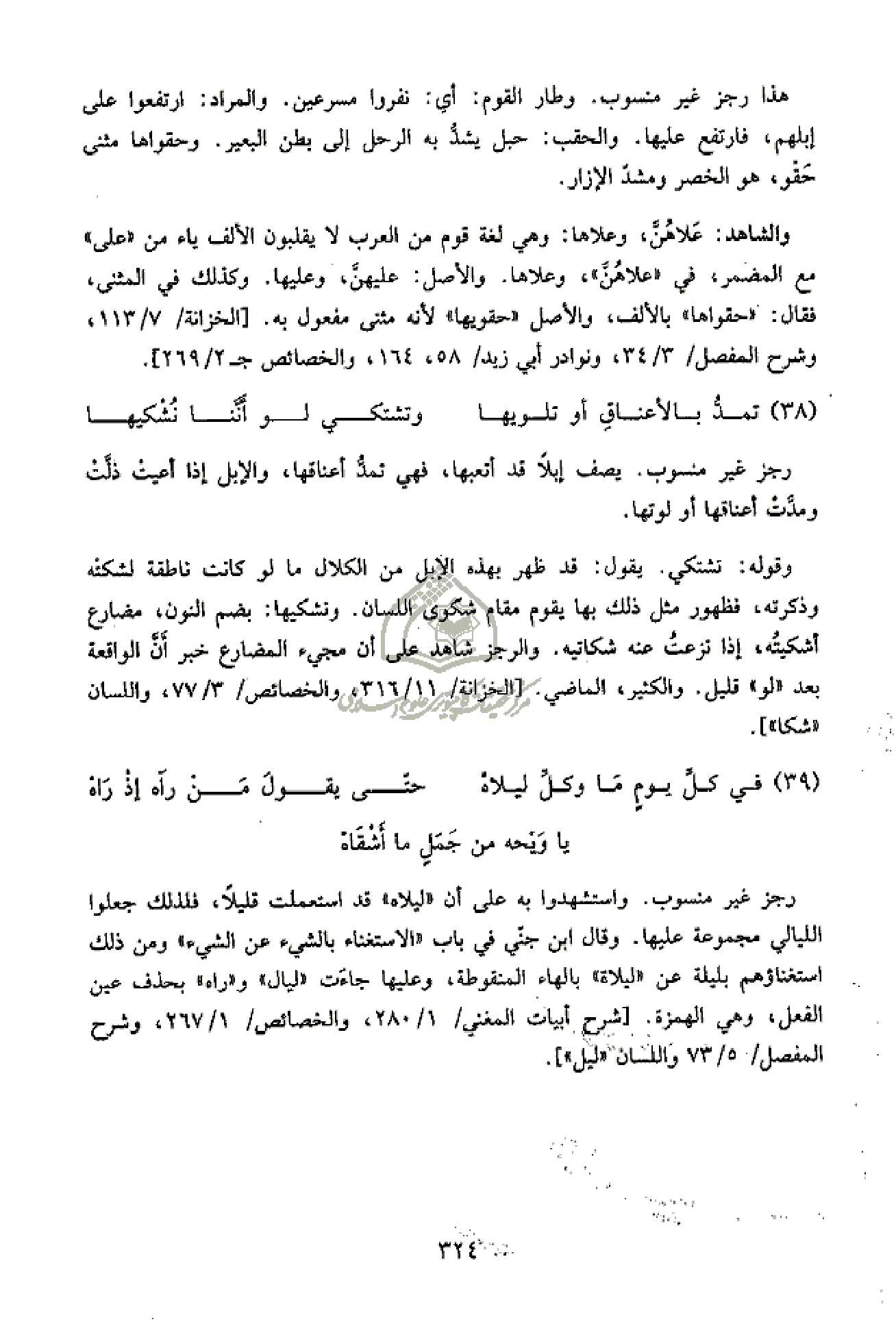 وقوله: تشتكي. يقول: قد ظهر بهذه الإبل من الكلال ما لو كانت ناطقة لشكته وذكرته، فظهور مثل ذلك بها يقوم مقام شكوى اللسان. ونشكيها: بضم النون، مضارع أشكيته، إذا نزعت عنه شكاتيه. والرجز شاهد على أن مجيء المضارع خبر أنّ الواقعة بعد «لو» قليل. والكثير، الماضي. [الخزانة/ 11/ 316، والخصائص/ 3/ 77، واللسان «شكا»].