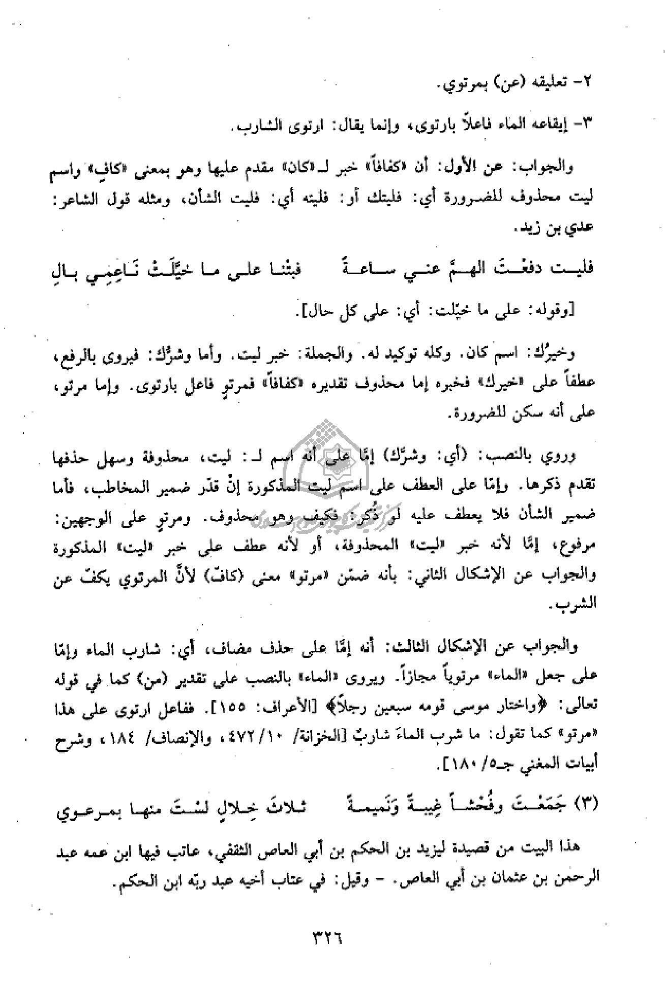 والجواب عن الإشكال الثالث: أنه إمّا على حذف مضاف، أي: شارب الماء وإمّا على جعل «الماء» مرتويا مجازا. ويروى «الماء» بالنصب على تقدير (من) كما في قوله تعالى: وَاخْتارَ مُوسى قَوْمَهُ سَبْعِينَ رَجُلًا [الأعراف: 155]. ففاعل ارتوى على هذا «مرتو» كما تقول: ما شرب الماء شارب [الخزانة/ 10/ 472، والإنصاف/ 184، وشرح أبيات المغني ج 5/ 180].