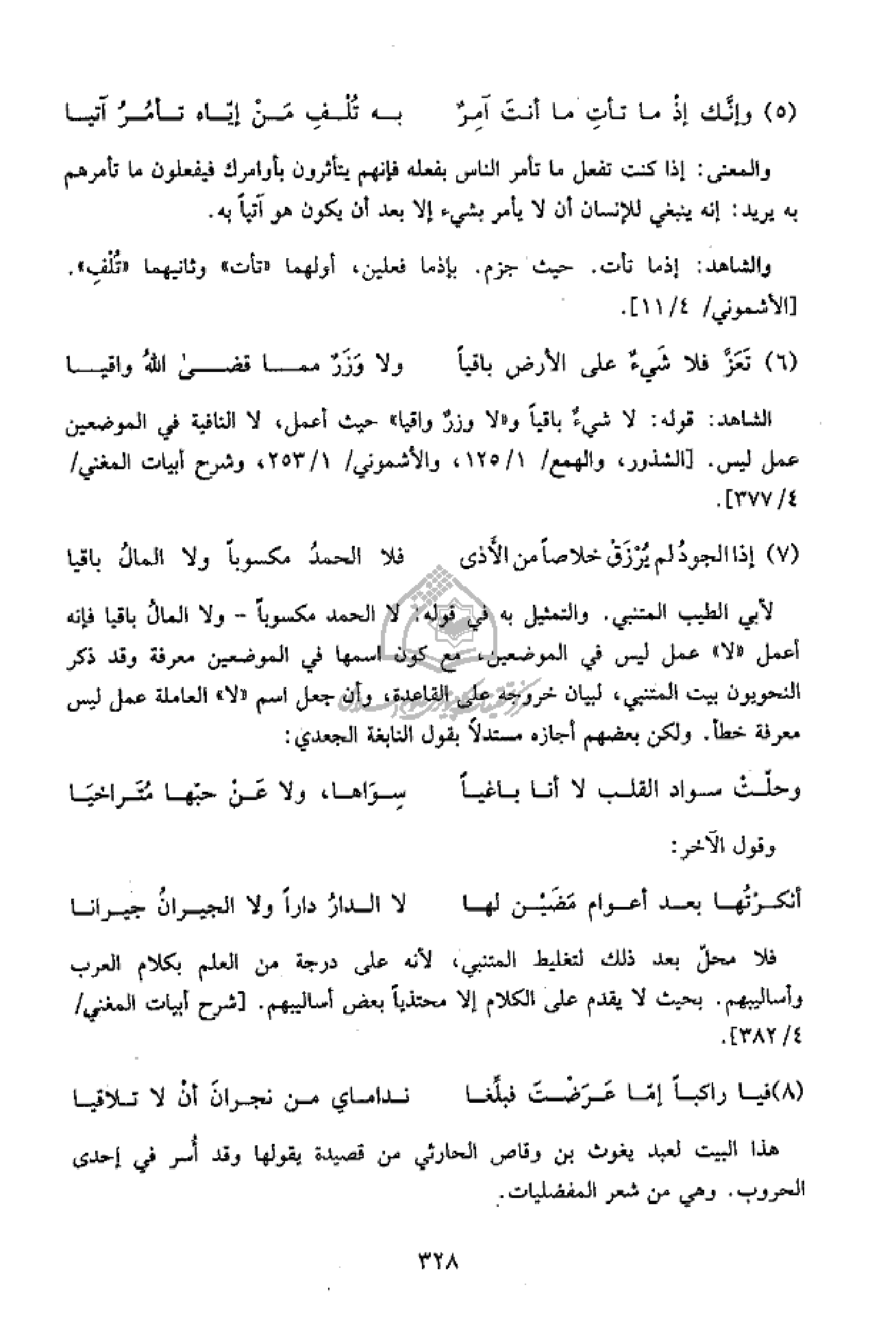 لأبي الطيب المتنبي. والتمثيل به في قوله: لا الحمد مكسوبا - ولا المال باقيا فإنه أعمل «لا» عمل ليس في الموضعين، مع كون اسمها في الموضعين معرفة وقد ذكر النحويون بيت المتنبي، لبيان خروجه على القاعدة، وأن جعل اسم «لا» العاملة عمل ليس معرفة خطأ. ولكن بعضهم أجازه مستدلا بقول النابغة الجعدي: