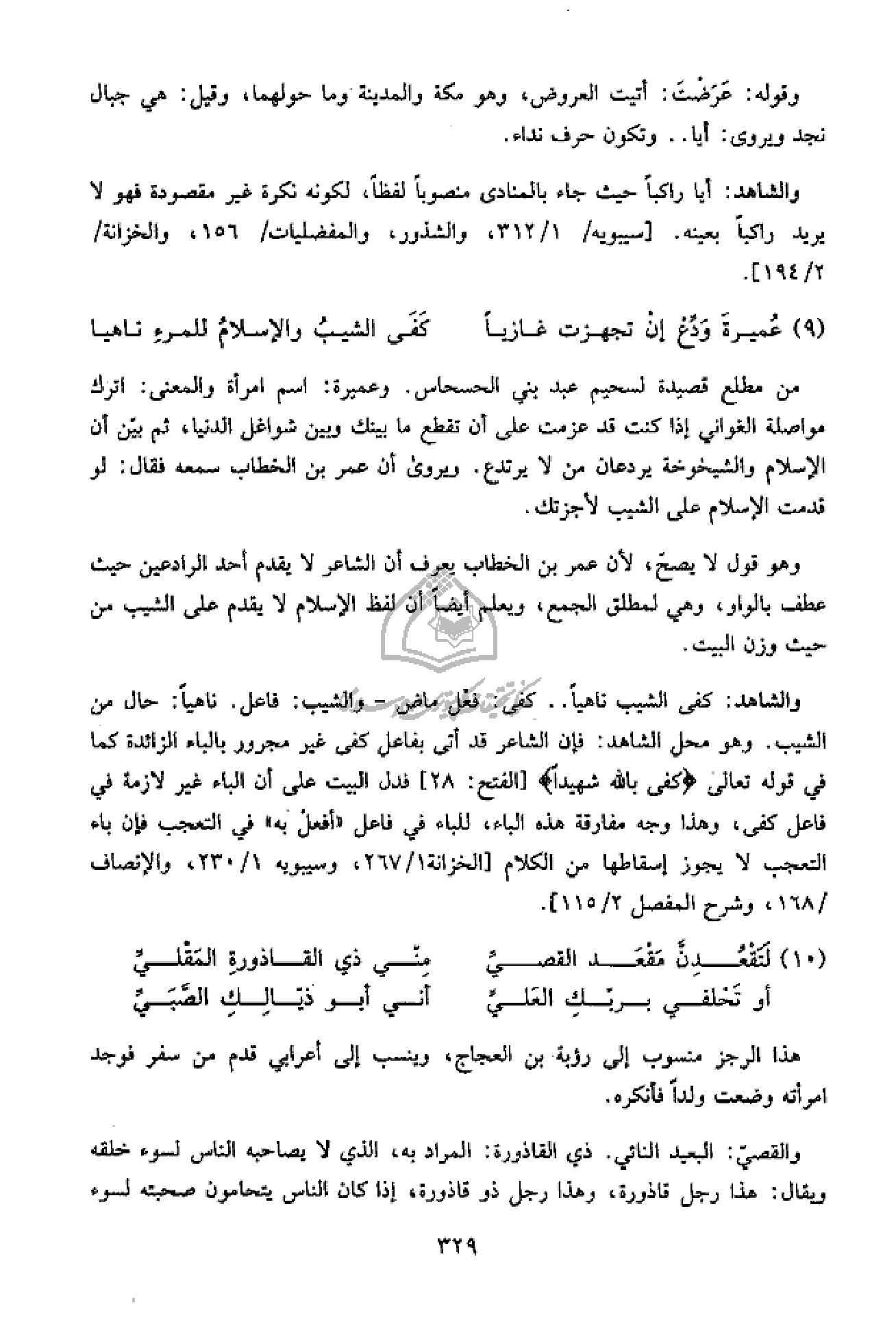 وهو قول لا يصحّ، لأن عمر بن الخطاب يعرف أن الشاعر لا يقدم أحد الرادعين حيث عطف بالواو، وهي لمطلق الجمع، ويعلم أيضا أن لفظ الإسلام لا يقدم على الشيب من حيث وزن البيت.