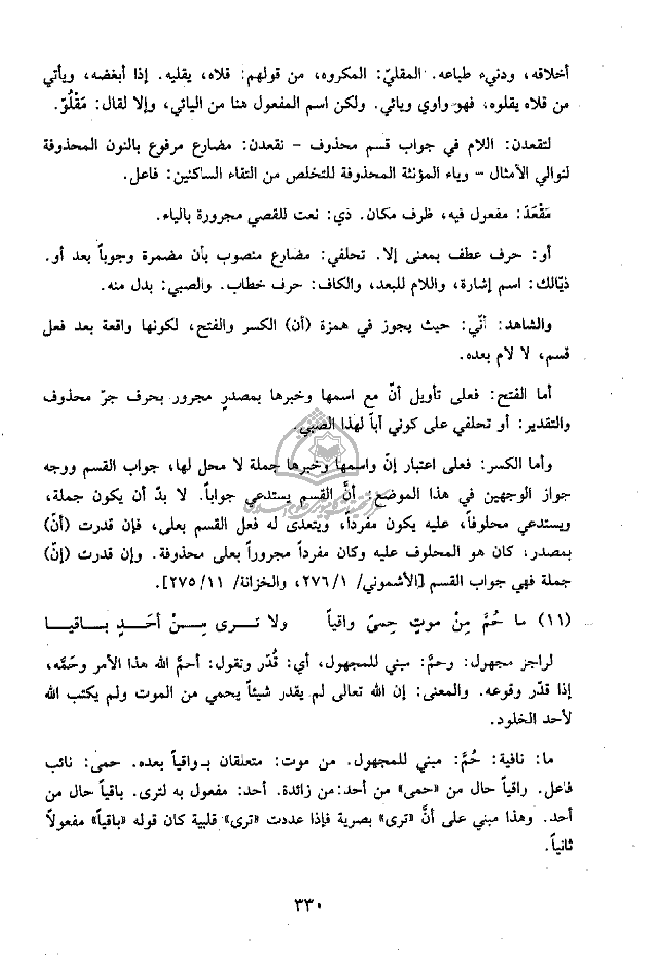 لراجز مجهول: وحمّ: مبني للمجهول، أي: قدّر وتقول: أحمّ الله هذا الأمر وحمّه، إذا قدّر وقوعه. والمعنى: إن الله تعالى لم يقدر شيئا يحمي من الموت ولم يكتب الله لأحد الخلود.