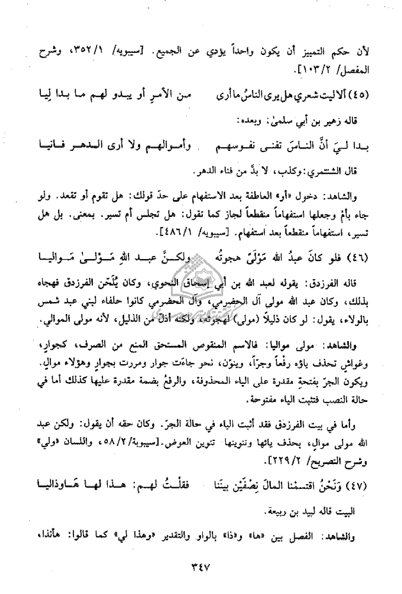 وأما في بيت الفرزدق فقد أثبت الياء في حالة الجرّ. وكان حقه أن يقول: ولكن عبد الله مولى موال، بحذف يائها وتنوينها تنوين العوض. [سيبويه/ 2/ 58، واللسان «ولي» وشرح التصريح/ 2/ 229].