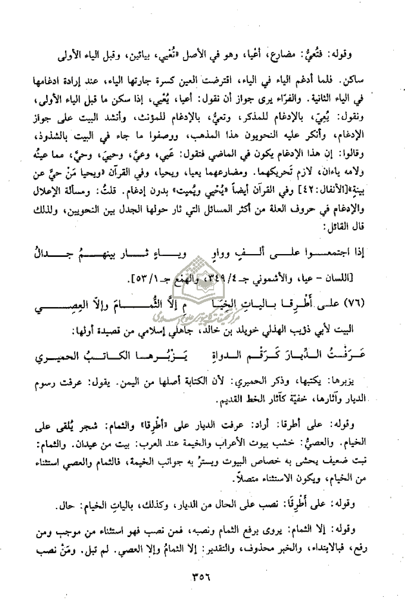ساكن. فلما أدغم الياء في الياء، اقترضت العين كسرة جارتها الياء، عند إرادة ادغامها في الياء الثانية. والفرّاء يرى جواز أن نقول: أعيا، يعيي، إذا سكن ما قبل الياء الأولى، ونقول: يعيّ، بالإدغام للمذكر، وتعيّ، بالإدغام للمؤنث، وأنشد البيت على جواز الإدغام، وأنكر عليه النحويون هذا المذهب، ووصفوا ما جاء في البيت بالشذوذ، وقالوا: إن هذا الإدغام يكون في الماضي فتقول: عيي، وعيّ، وحيي، وحيّ، مما عينه ولامه ياءان، لازم تحريكهما. ومضارعهما يعيا، ويحيا، وفي القرآن «وَيَحْيى مَنْ حَيَّ عَنْ بَيِّنَةٍ» [الأنفال: 42] وفي القرآن أيضا «يُحْيِي وَيُمِيتُ» * بدون إدغام. قلت: ومسألة الإعلال والإدغام في حروف العلة من أكثر المسائل التي ثار حولها الجدل بين النحويين، ولذلك قال القائل: