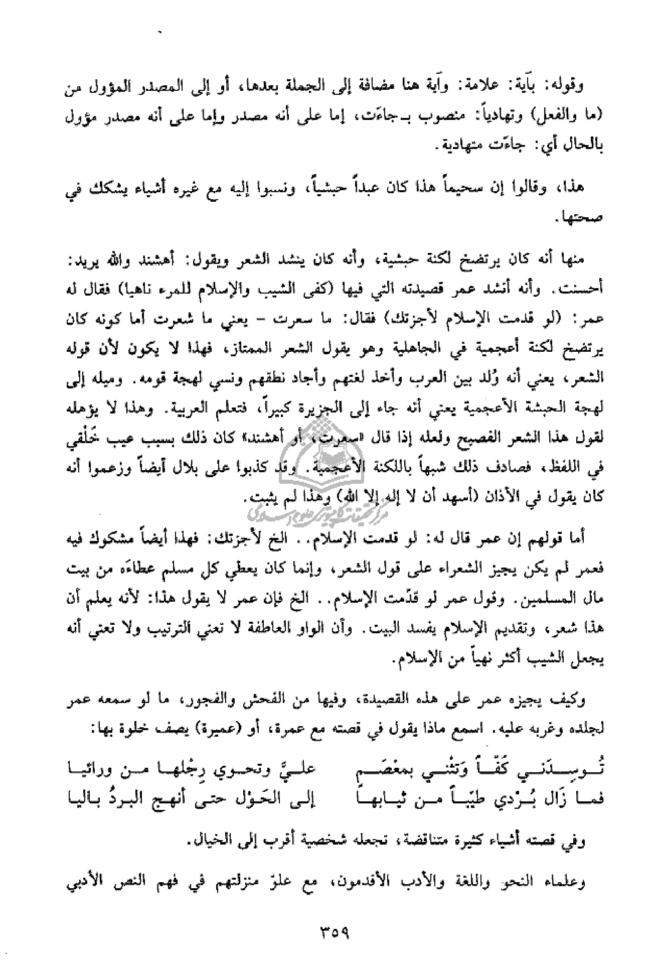 أما قولهم إن عمر قال له: لو قدمت الإسلام .. الخ لأجزتك: فهذا أيضا مشكوك فيه فعمر لم يكن يجيز الشعراء على قول الشعر، وإنما كان يعطي كل مسلم عطاءه من بيت مال المسلمين. وقول عمر لو قدّمت الإسلام .. الخ فإن عمر لا يقول هذا: لأنه يعلم أن هذا شعر، وتقديم الإسلام يفسد البيت. وأن الواو العاطفة لا تعني الترتيب ولا تعني أنه يجعل الشيب أكثر نهيا من الإسلام.