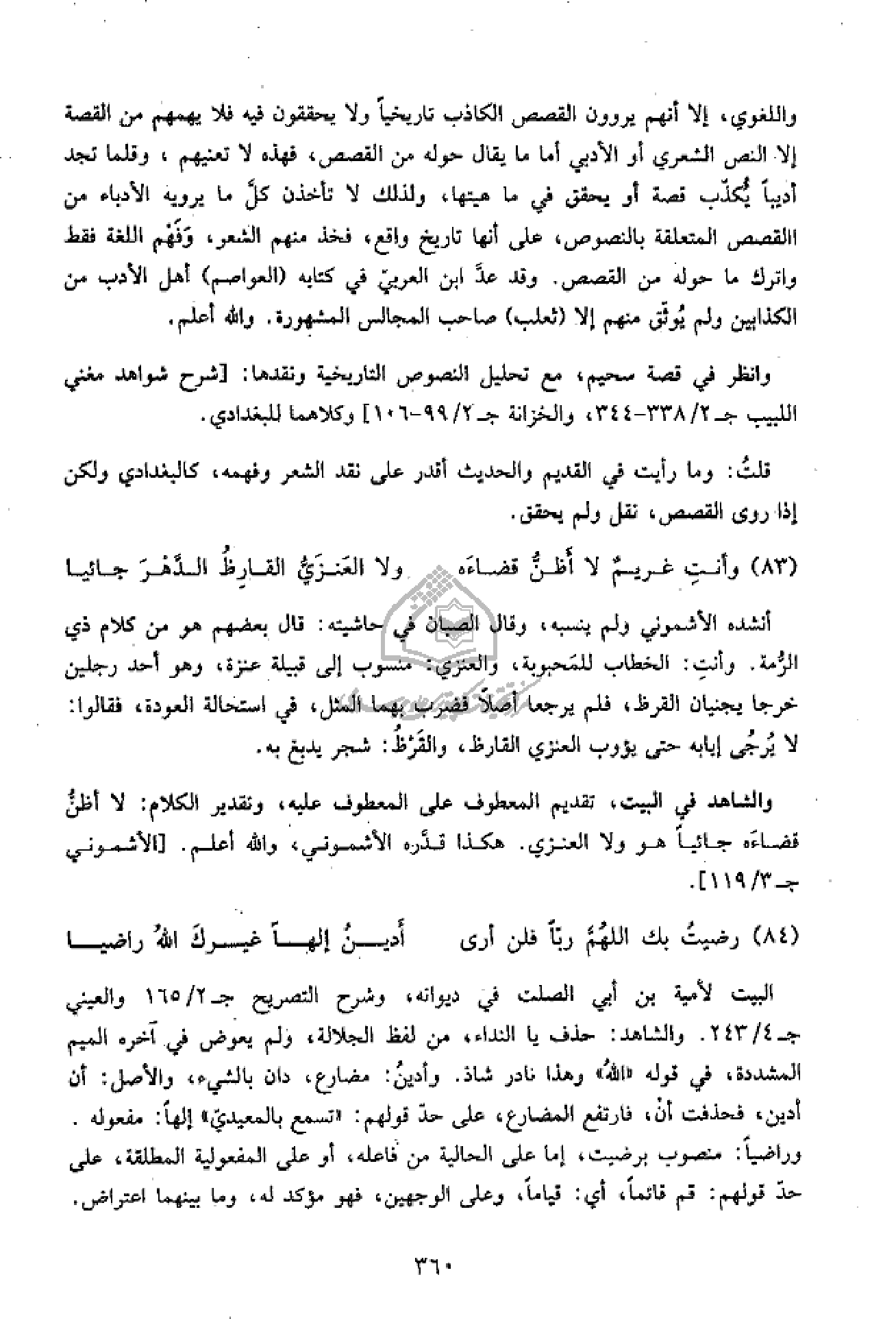 واللغوي، إلا أنهم يروون القصص الكاذب تاريخيا ولا يحققون فيه فلا يهمهم من القصة إلا النص الشعري أو الأدبي أما ما يقال حوله من القصص، فهذه لا تعنيهم، وقلما تجد أديبا يكذّب قصة أو يحقق في ما هيتها، ولذلك لا تأخذن كلّ ما يرويه الأدباء من القصص المتعلقة بالنصوص، على أنها تاريخ واقع، فخذ منهم الشعر، وفهم اللغة فقط واترك ما حوله من القصص. وقد عدّ ابن العربيّ في كتابه (العواصم) أهل الأدب من الكذابين ولم يوثّق منهم إلا (ثعلب) صاحب المجالس المشهورة. والله أعلم.