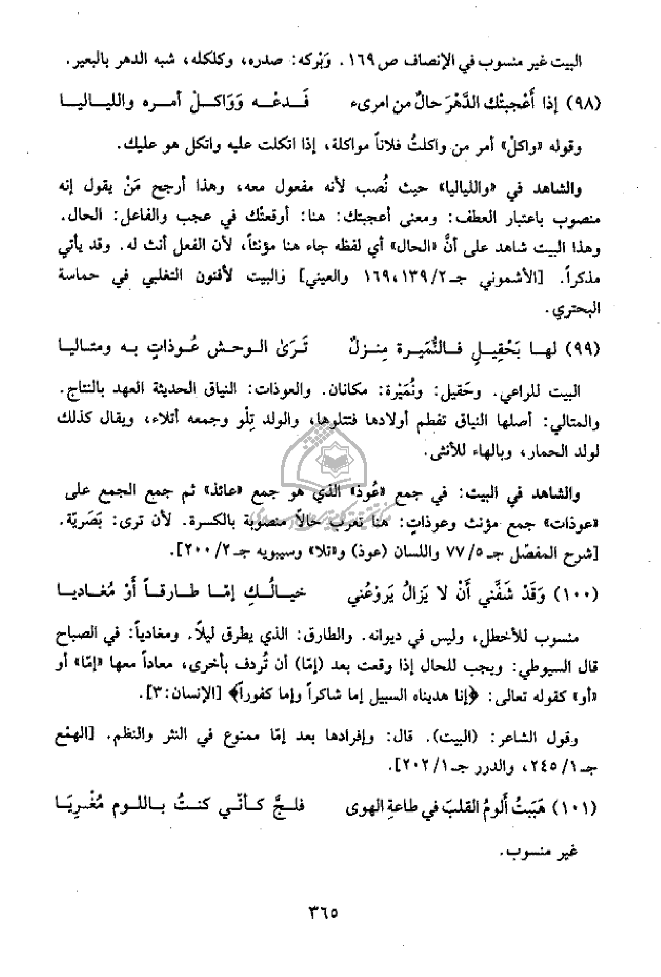 وهذا البيت شاهد على أنّ «الحال» أي لفظه جاء هنا مؤنثا، لأن الفعل أنث له. وقد يأتي مذكرا. [الأشموني ج 2/ 139، 169 والعيني] والبيت لأفنون التغلبي في حماسة البحتري.