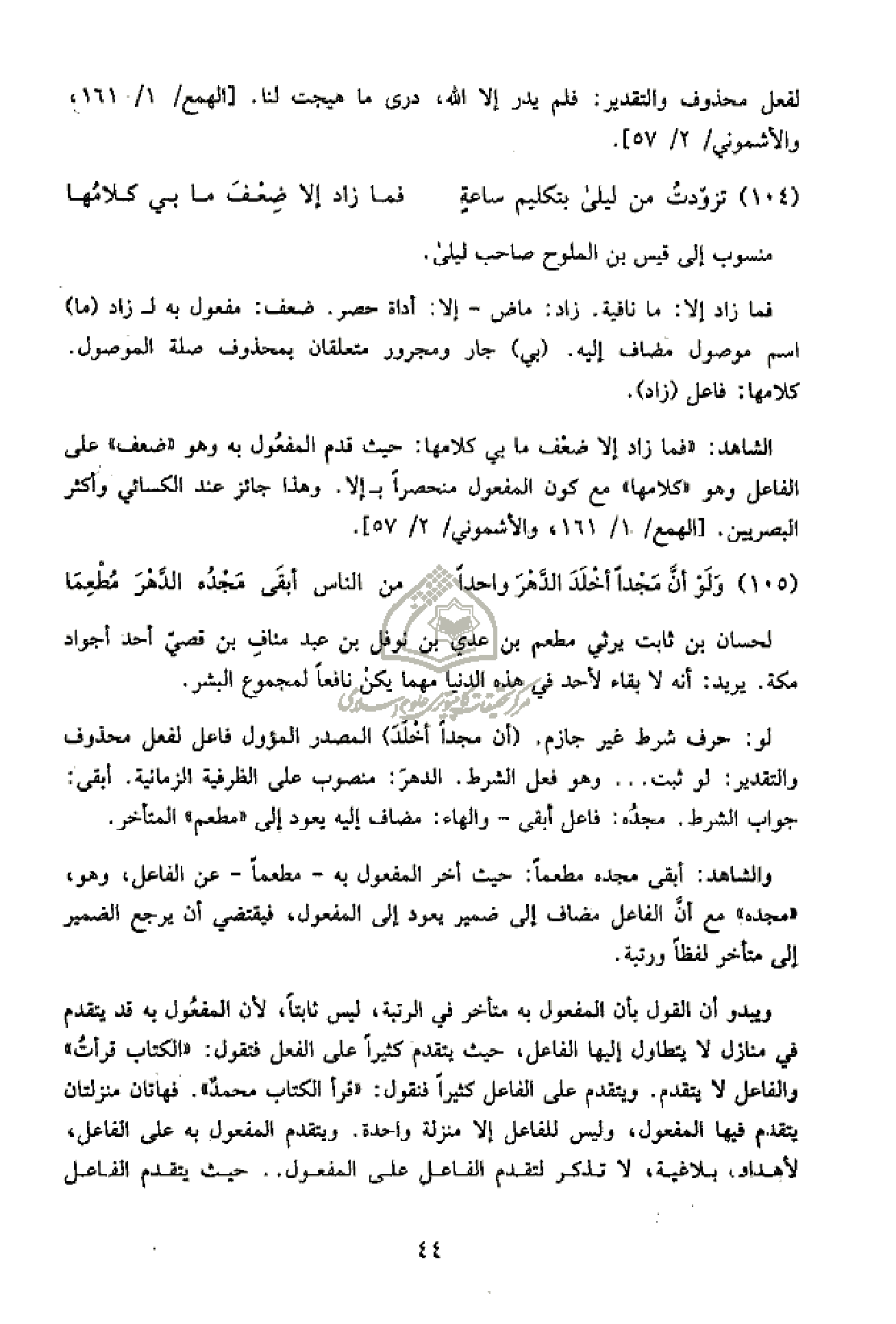 الشاهد: «فما زاد إلا ضعف ما بي كلامها: حيث قدم المفعول به وهو «ضعف» على الفاعل وهو «كلامها» مع كون
