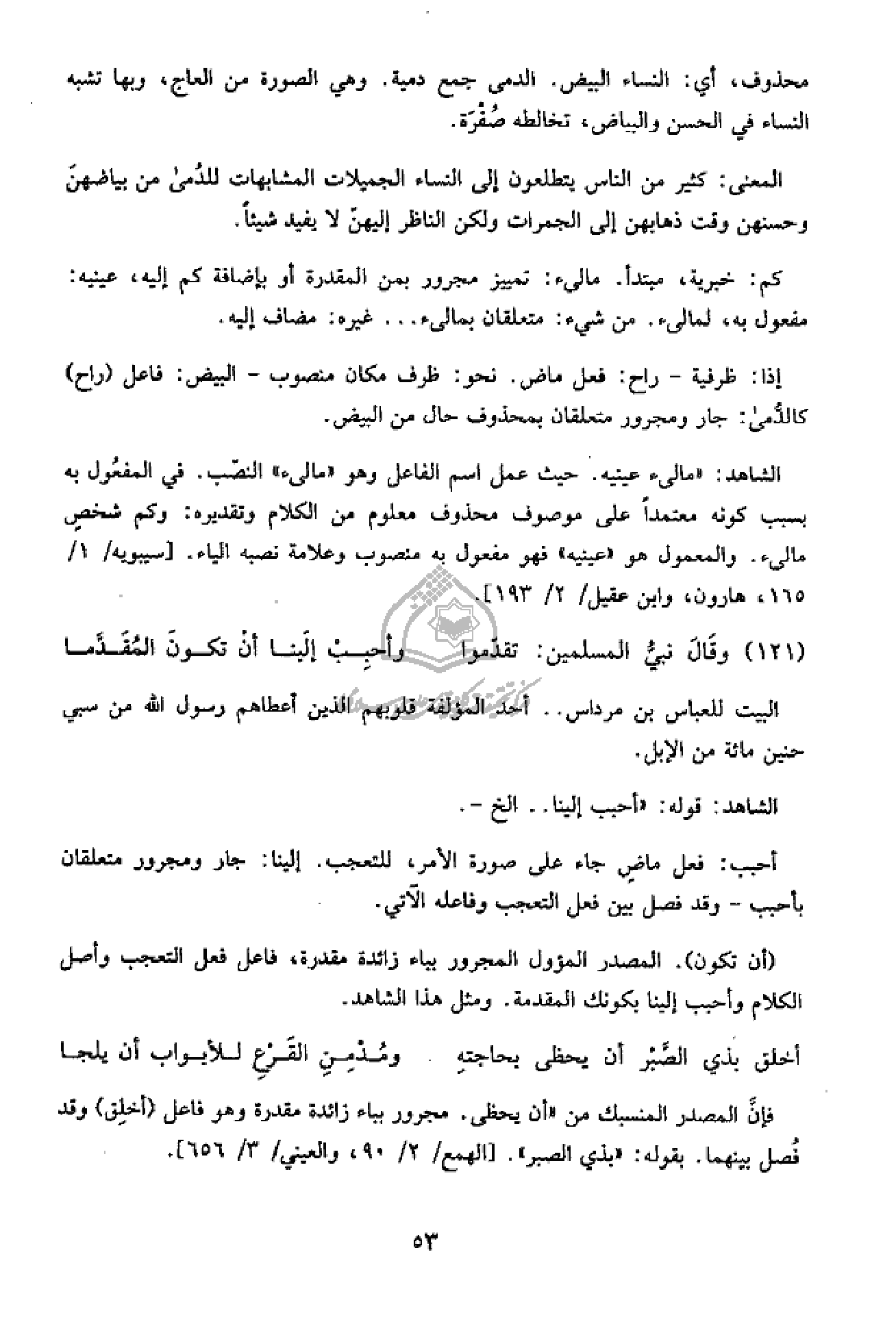 الشاهد: «مالئ عينيه. حيث عمل اسم الفاعل وهو «مالئ» النصّب. في المفعول به بسبب كونه معتمدا على موصوف محذوف معلوم من الكلام وتقديره: وكم شخص مالئ. والمعمول هو «عينيه» فهو مفعول به منصوب وعلامة نصبه الياء. [سيبويه/ 1/ 165، هارون، وابن عقيل/ 2/ 193].