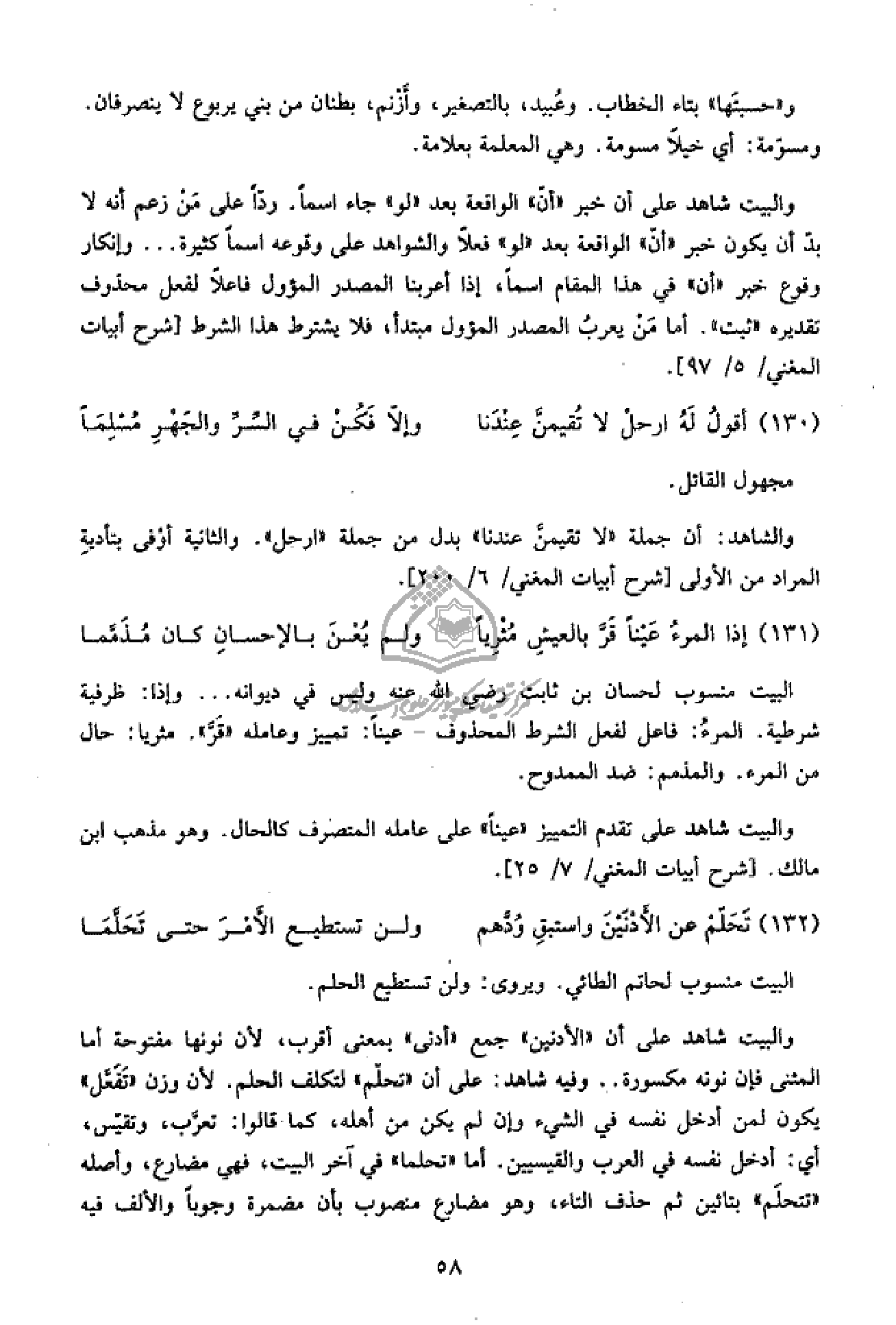 والبيت شاهد على أن «الأدنين» جمع «أدنى» بمعنى أقرب، لأن نونها مفتوحة أما المثنى فإن نونه مكسورة .. وفيه شاهد: على أن «تحلّم» لتكلف الحلم. لأن وزن «تفعّل» يكون لمن أدخل نفسه في الشيء وإن لم يكن من أهله، كما قالوا: تعرّب، وتقيّس، أي: أدخل نفسه في العرب والقيسيين. أما «تحلما» في آخر البيت، فهي مضارع، وأصله «تتحلم» بتائين ثم حذف التاء، وهو مضارع منصوب بأن مضمرة وجوبا والألف فيه
