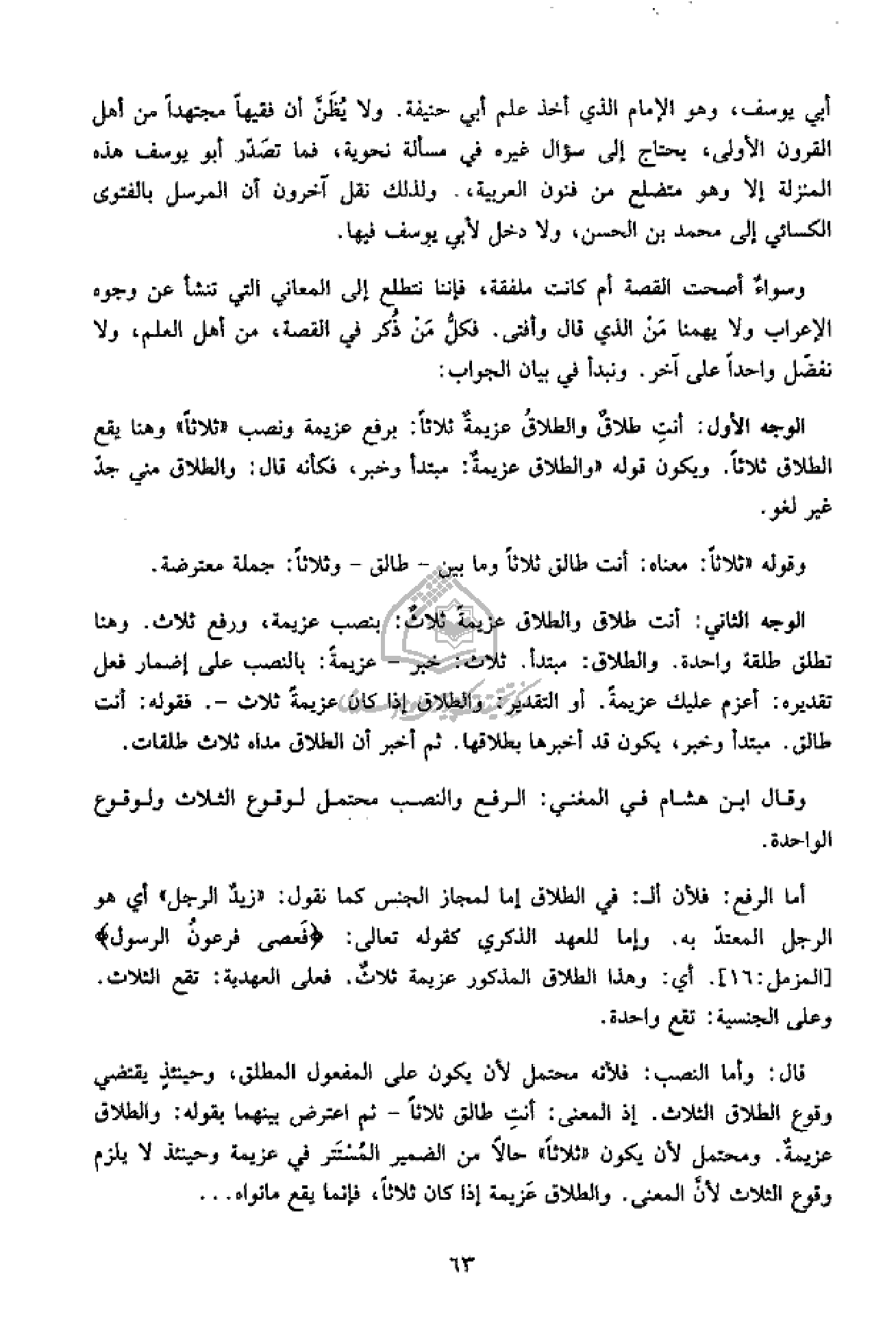 الوجه الأول: أنت طلاق والطلاق عزيمة ثلاثا: برفع عزيمة ونصب «ثلاثا» وهنا يقع الطلاق ثلاثا. ويكون قوله «والطلاق عزيمة: مبتدأ وخبر، فكأنه قال: والطلاق مني جدّ غير لغو.
